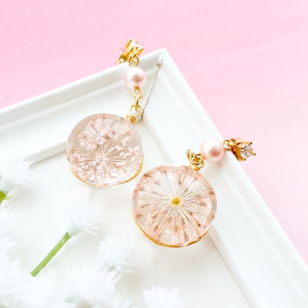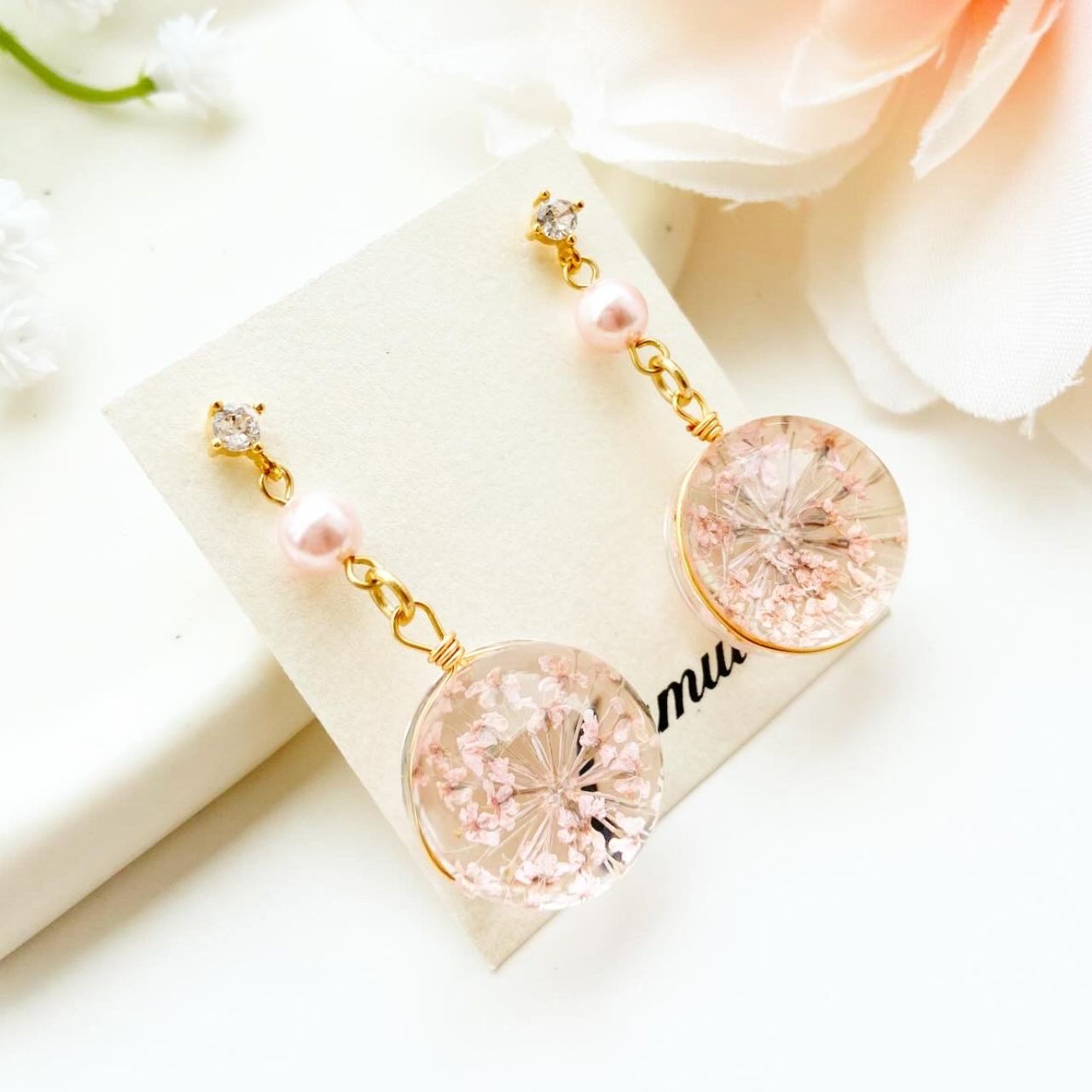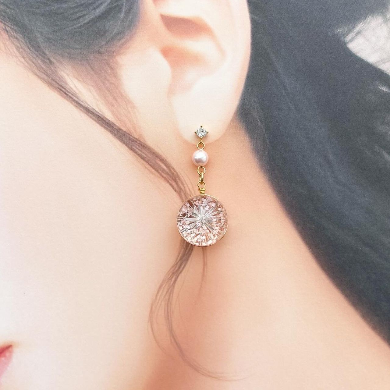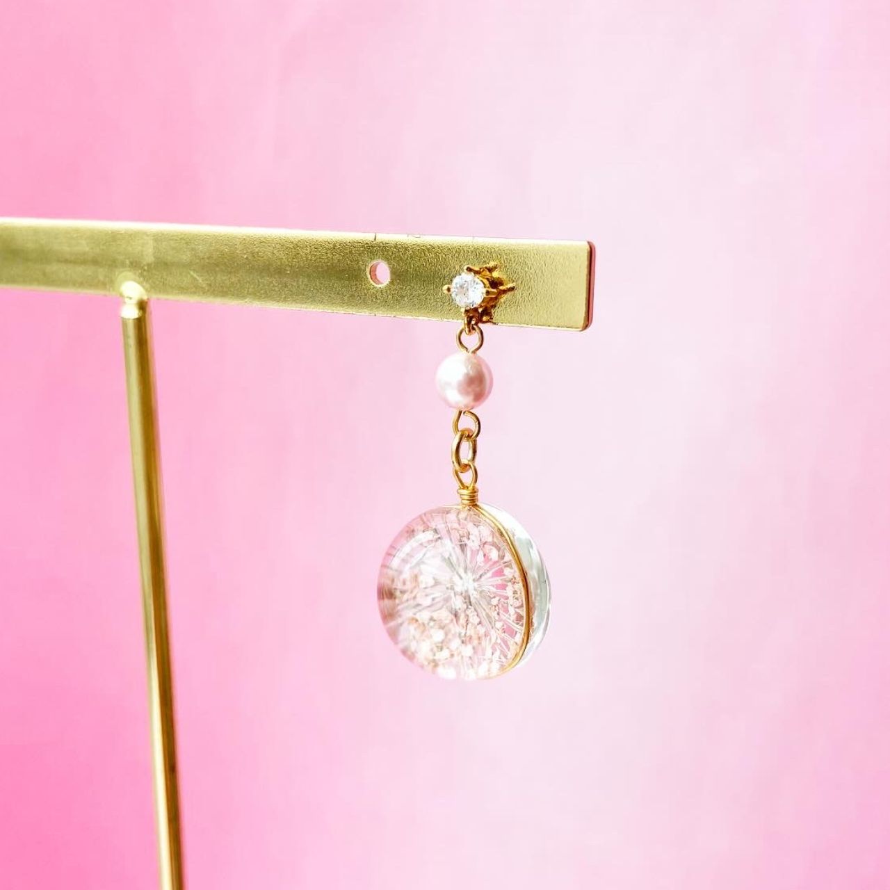 【ジルコニアきらめくドライフラワーとピンクパールのピアス】