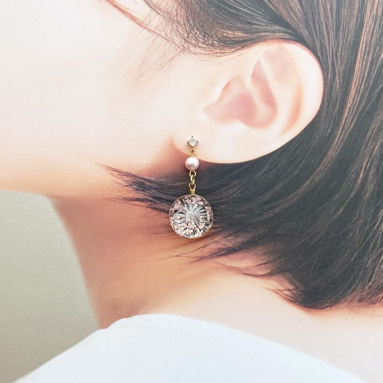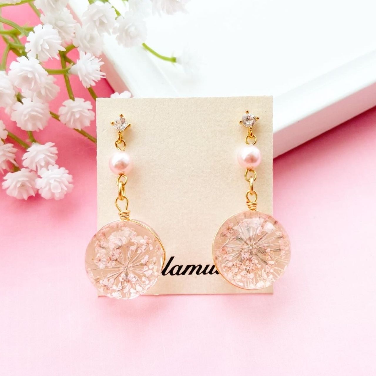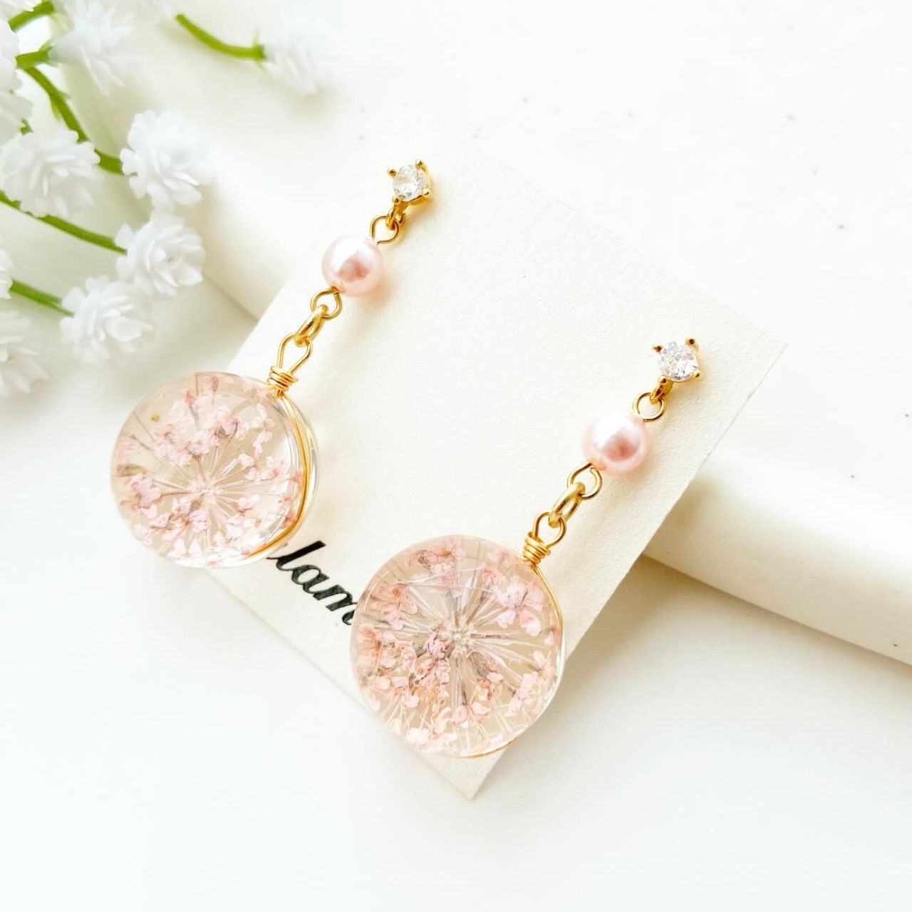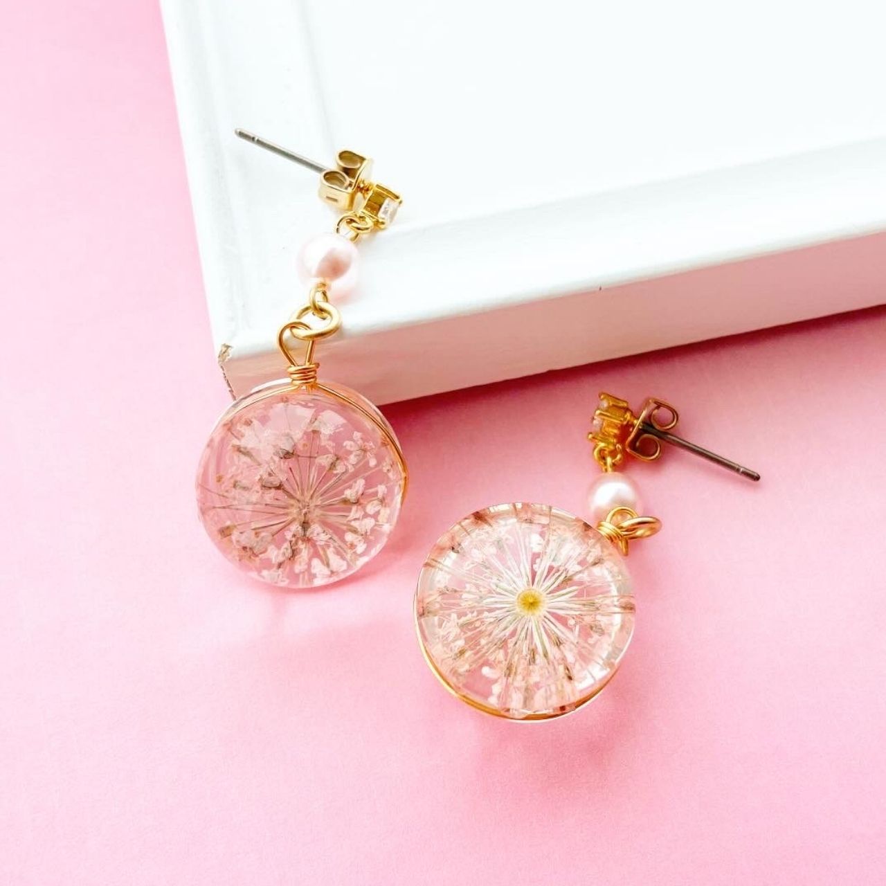 【ジルコニアきらめくドライフラワーとピンクパールのピアス】