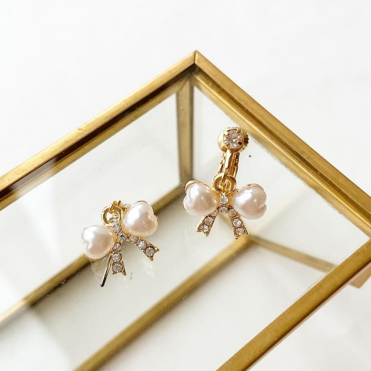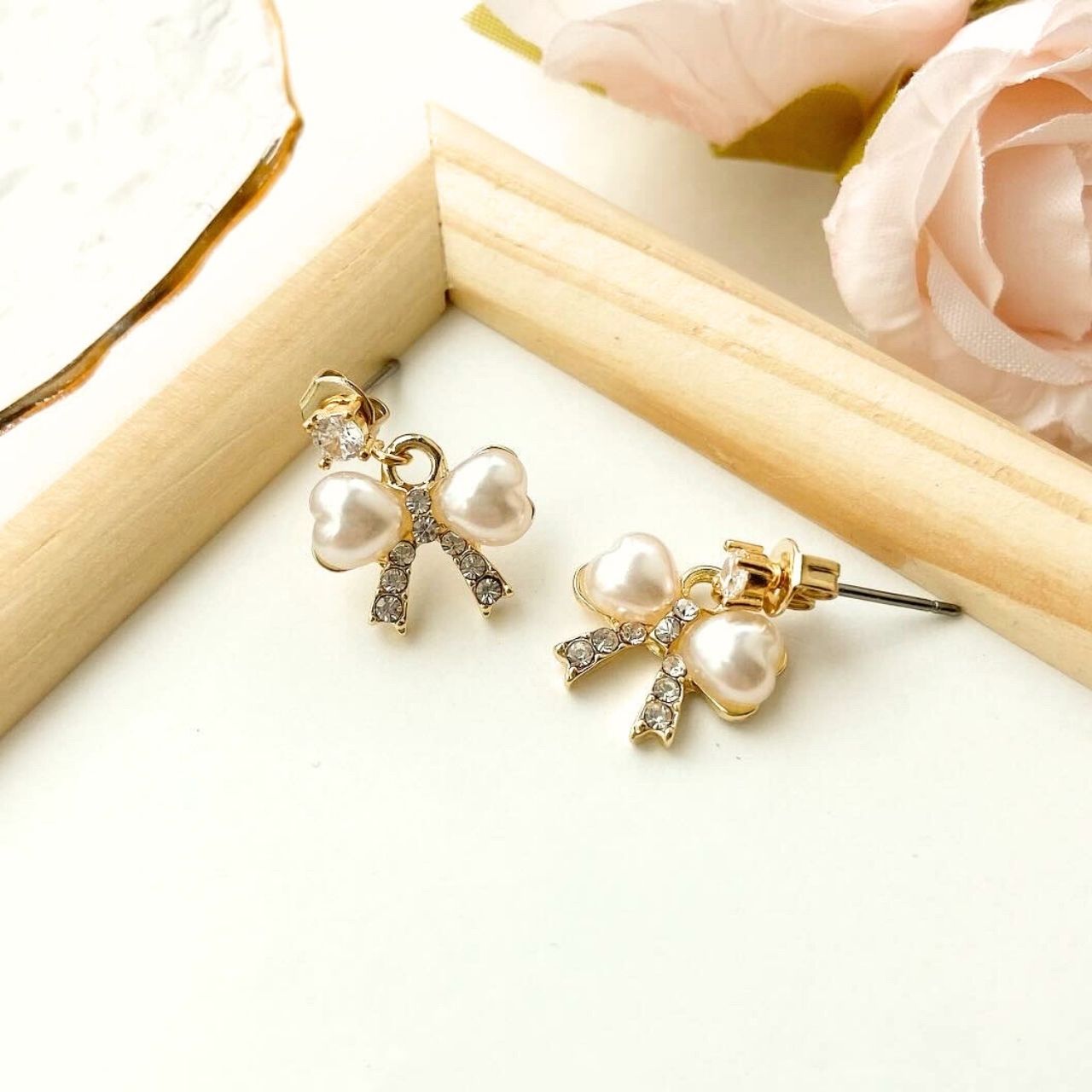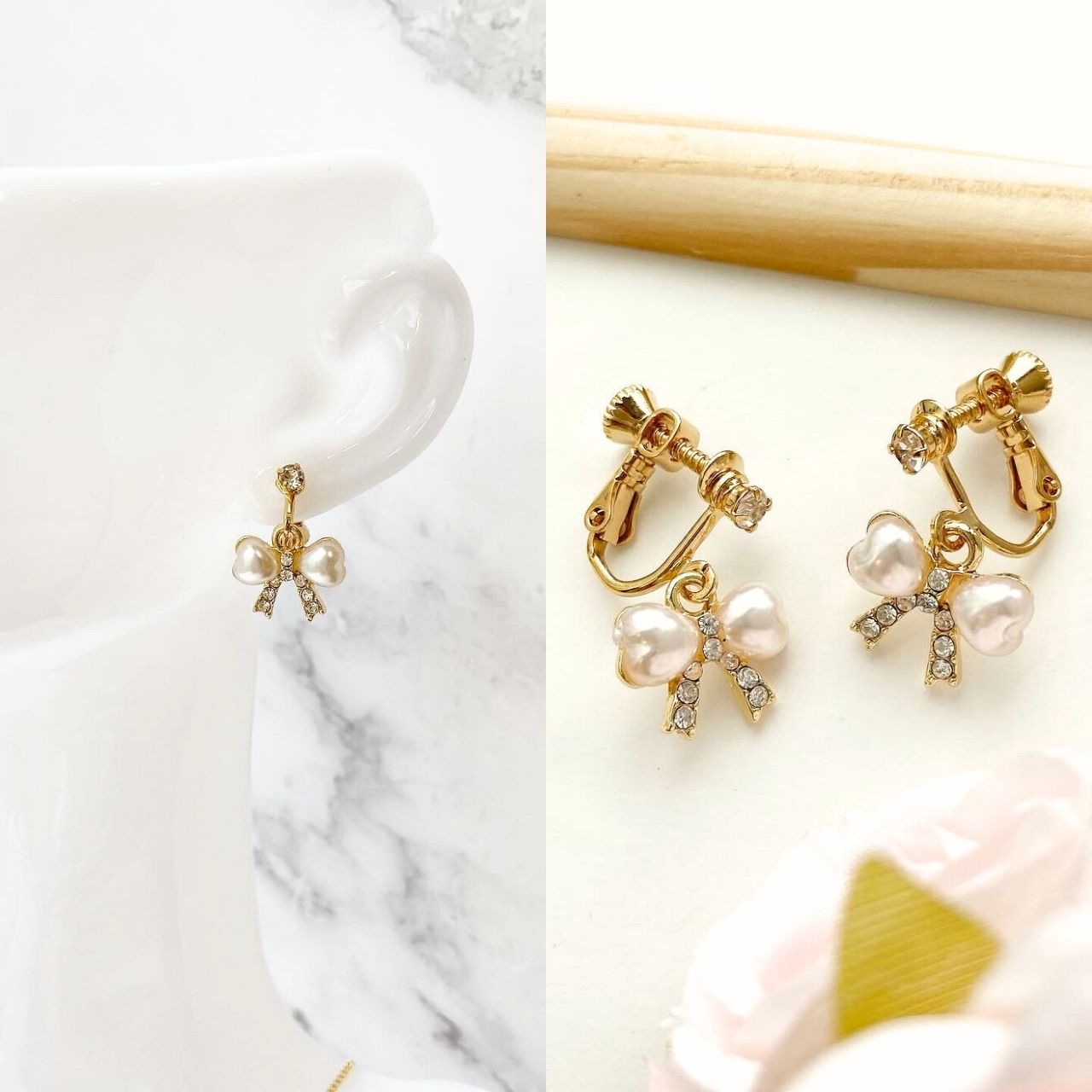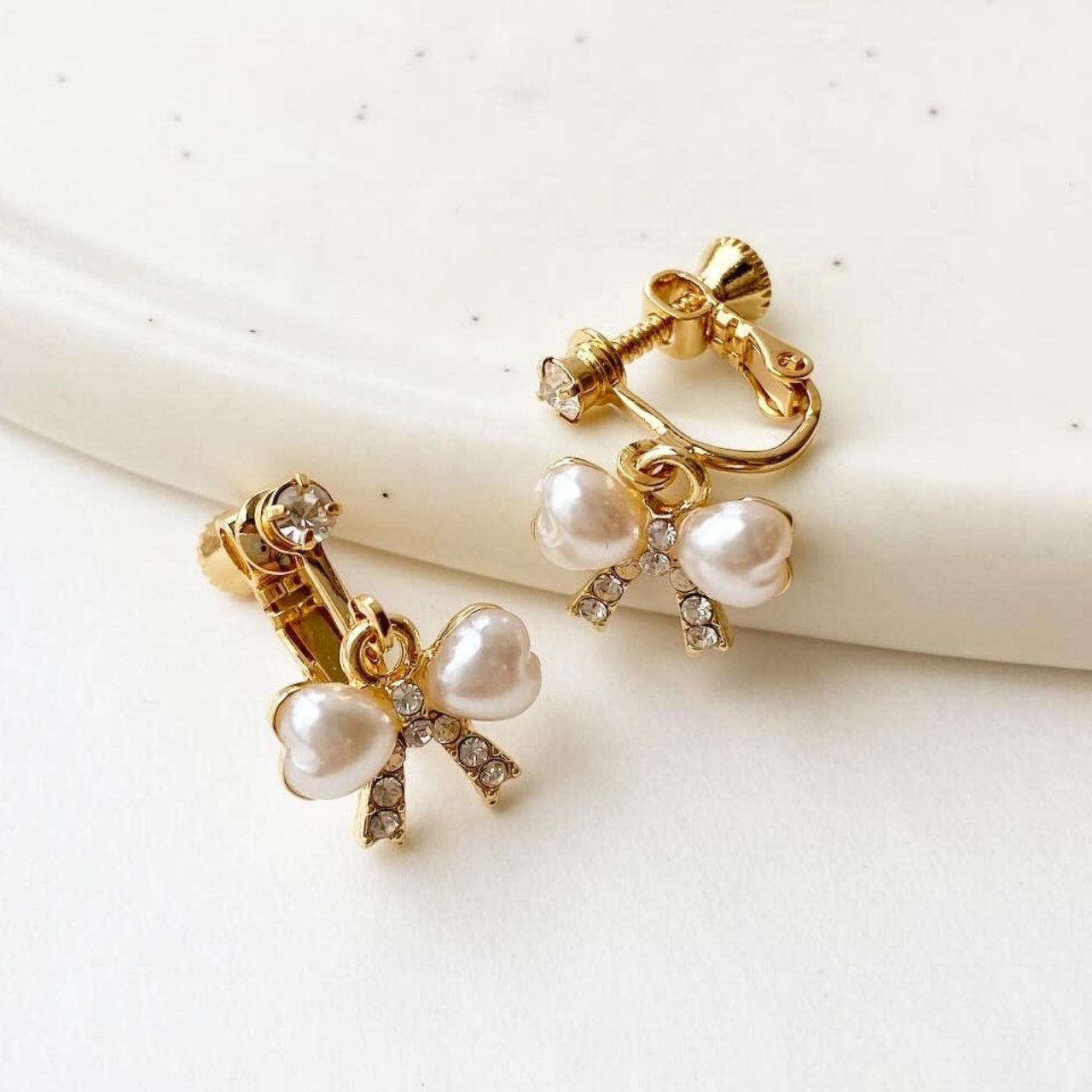 リボンモチーフのパールが優雅に揺れ、女性らしい柔らかさと気品を演出。