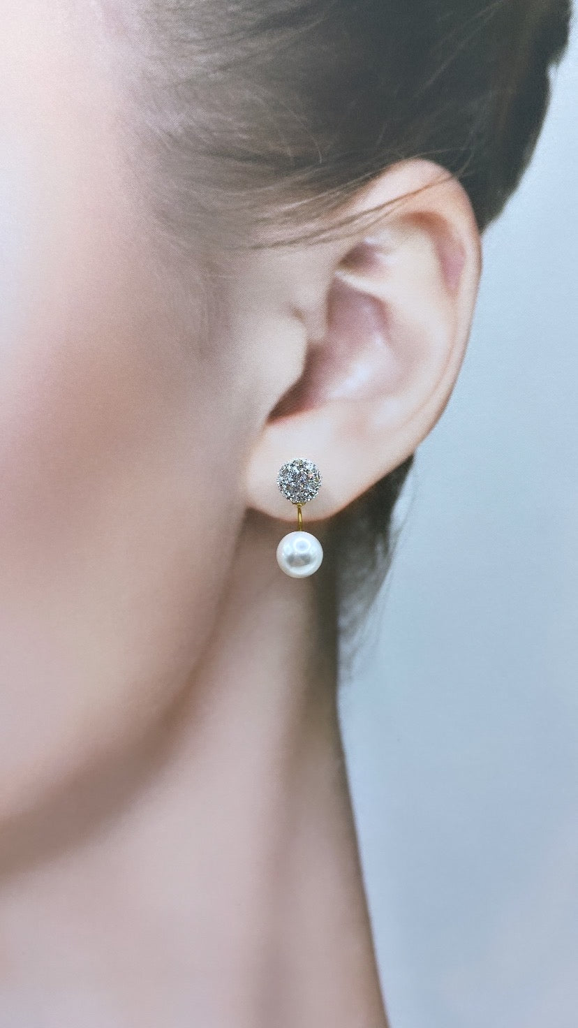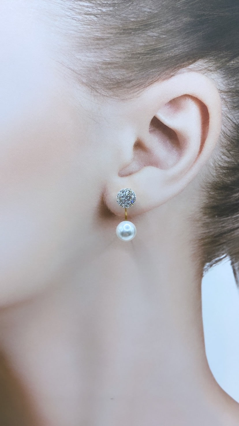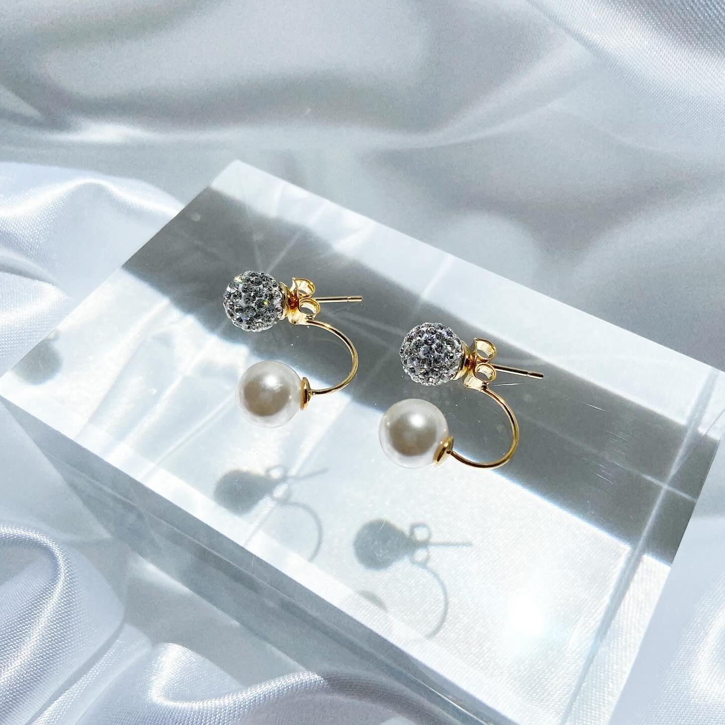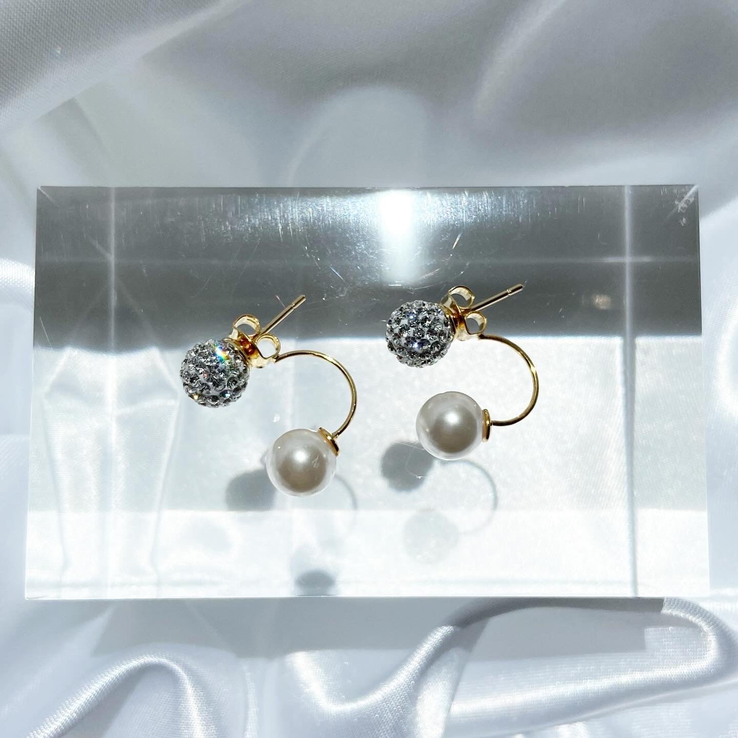 美しく輝くラインストーンボールとパールを合わせたピアスでございます。