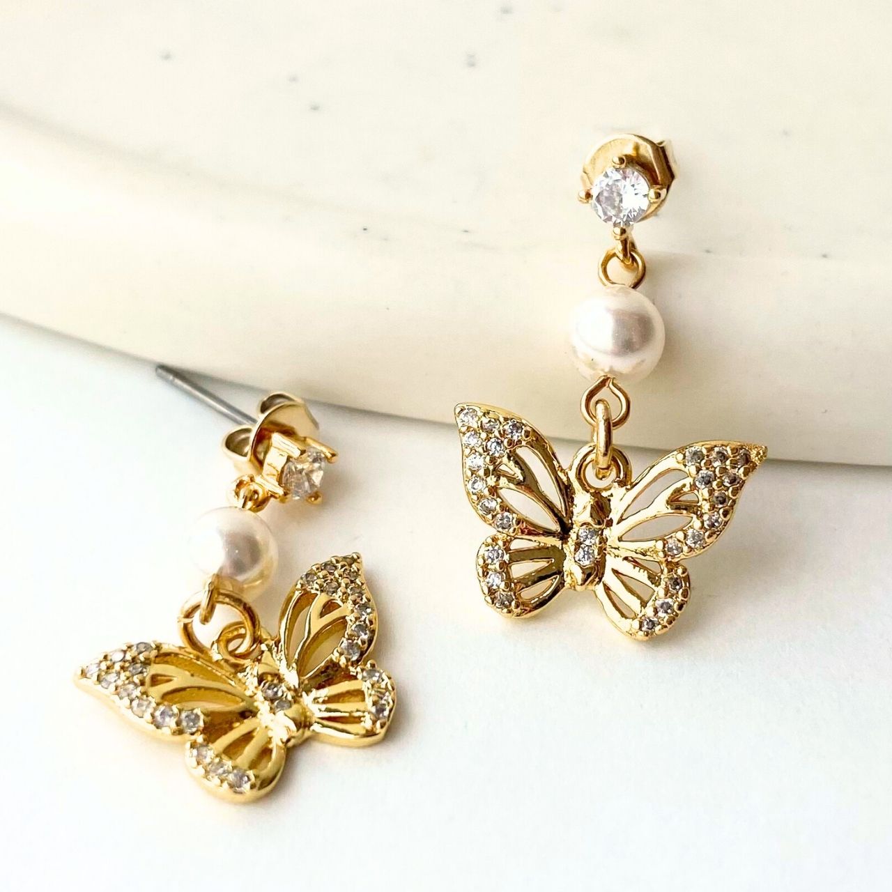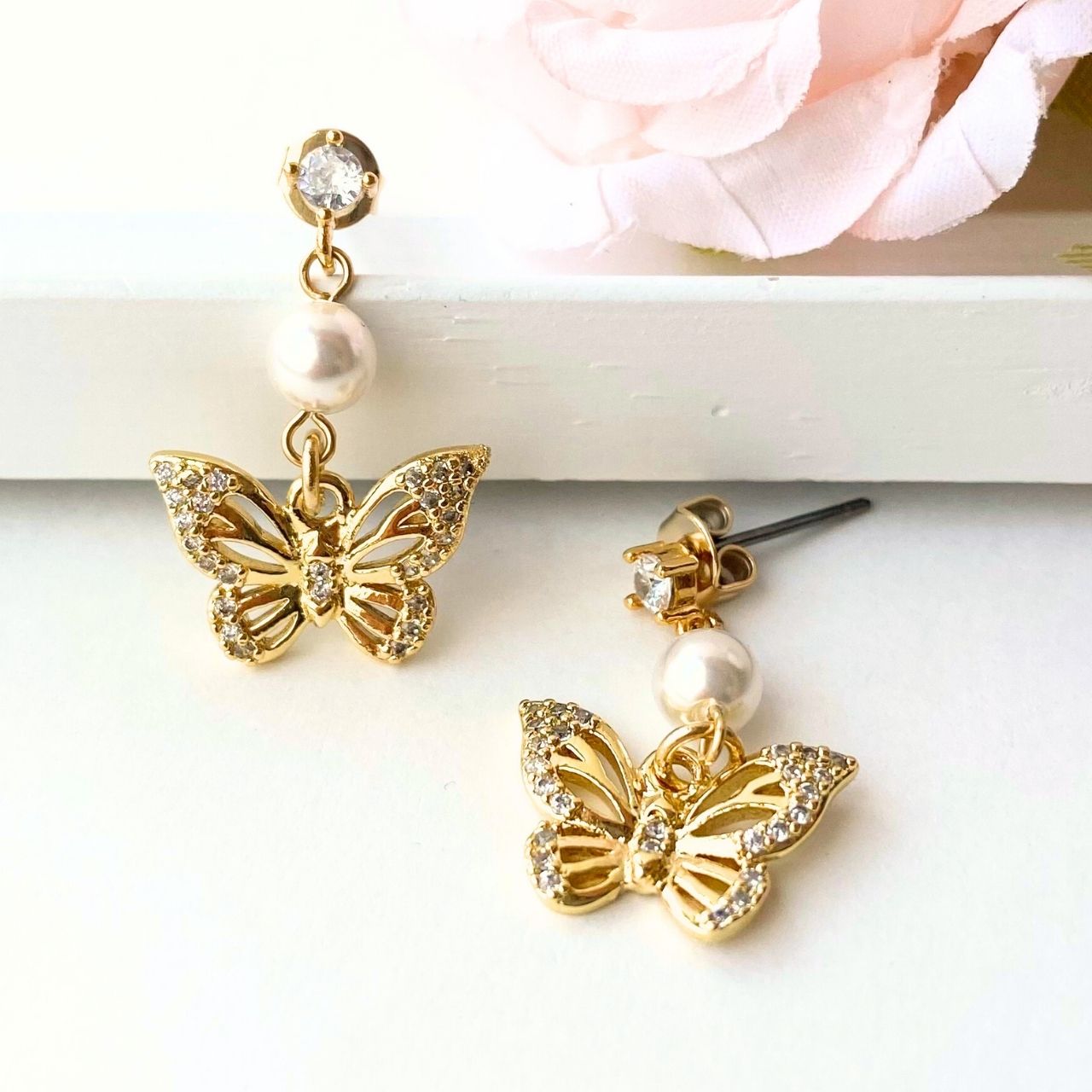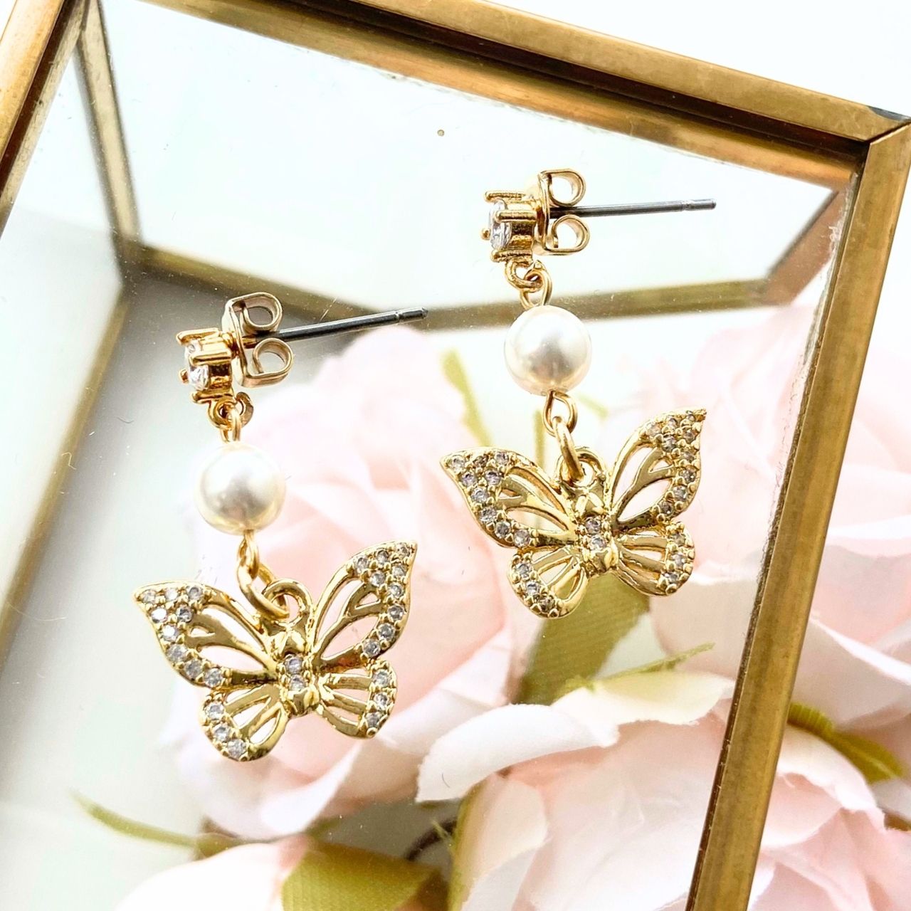 耳元で優雅に揺れるのは、蝶モチーフのピアス。