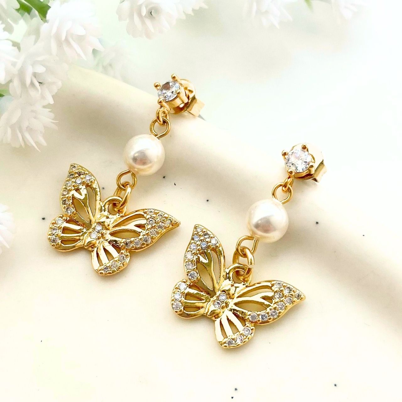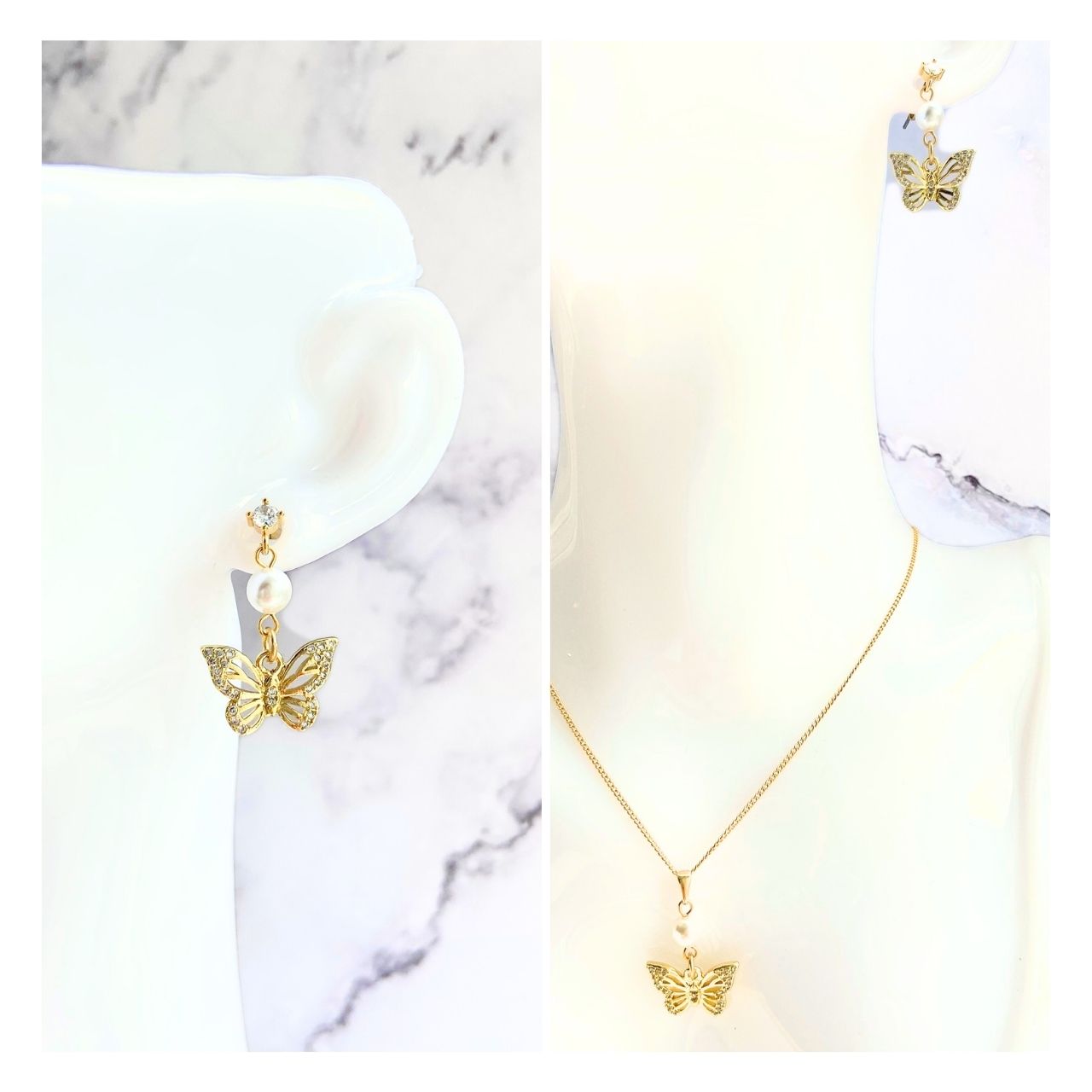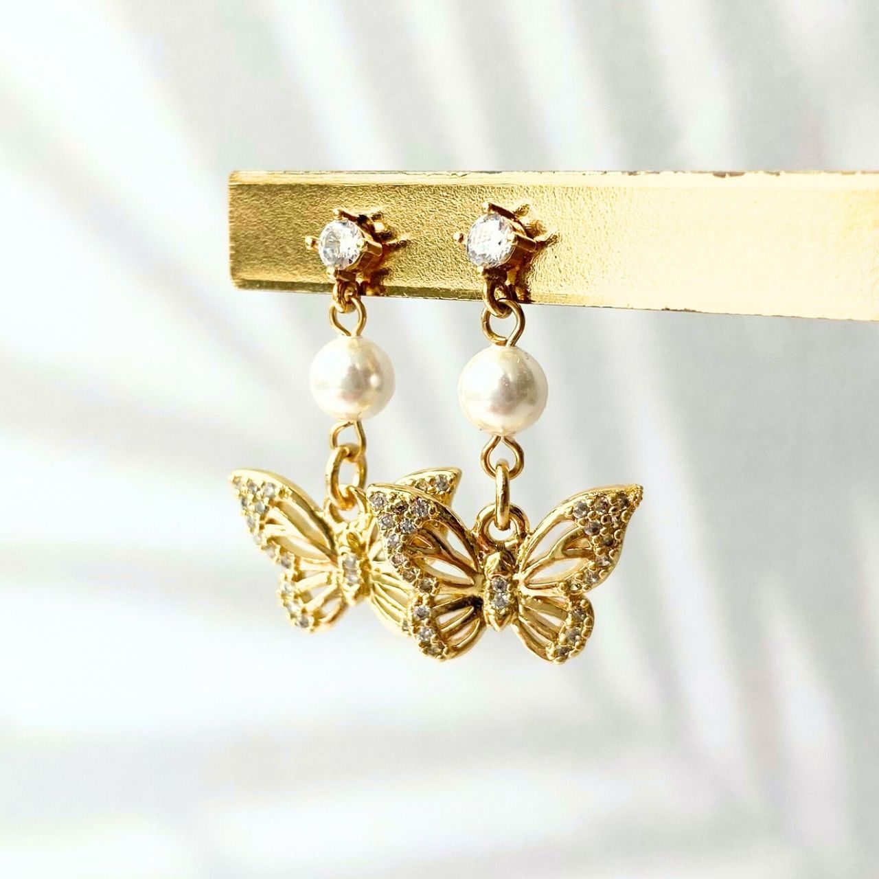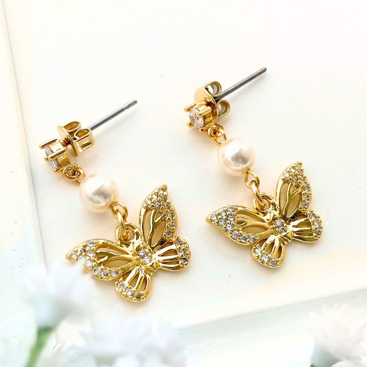 耳元で優雅に揺れるのは、蝶モチーフのピアス。
