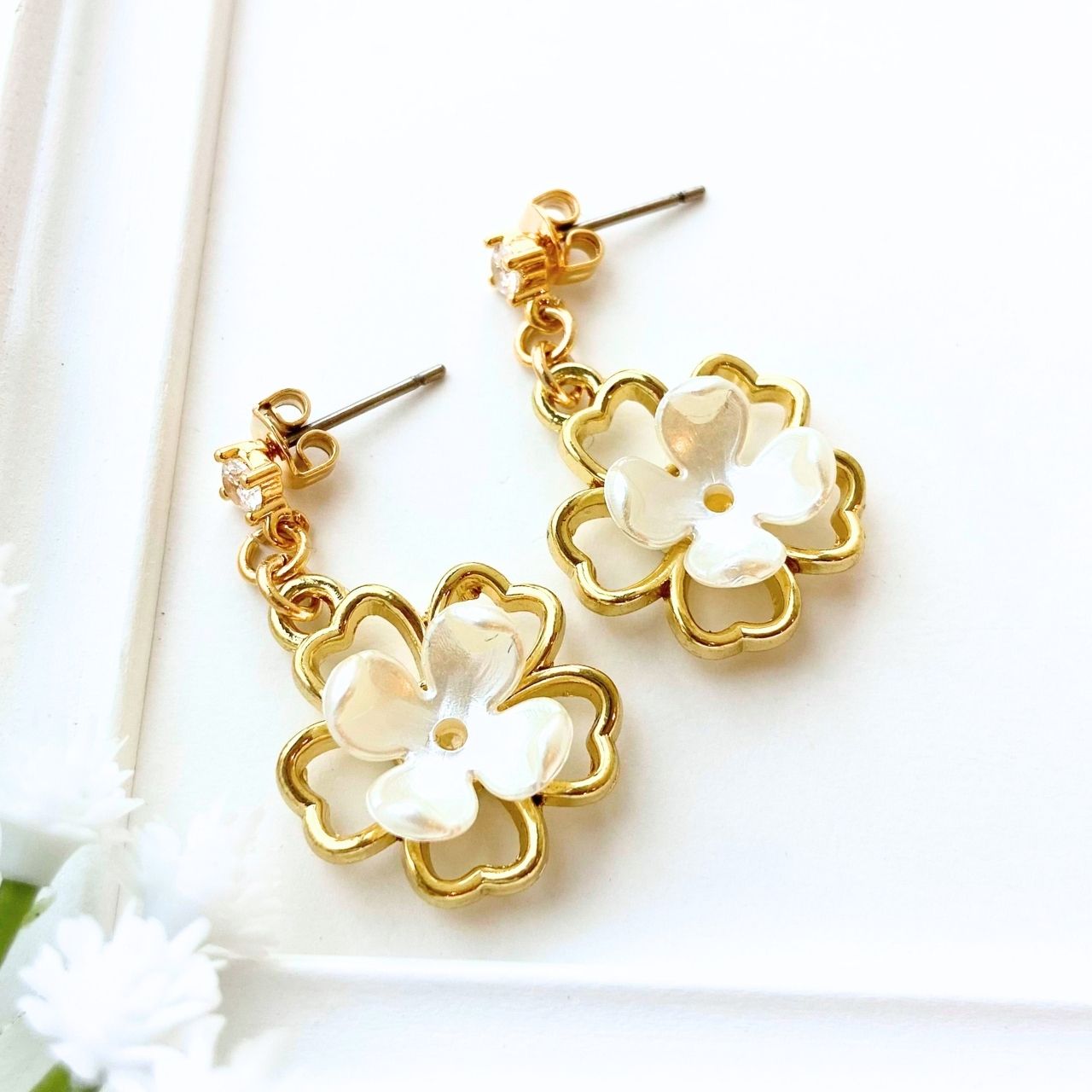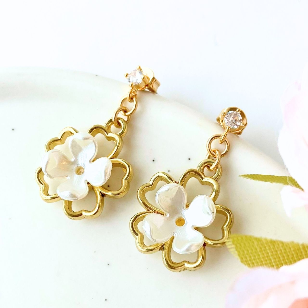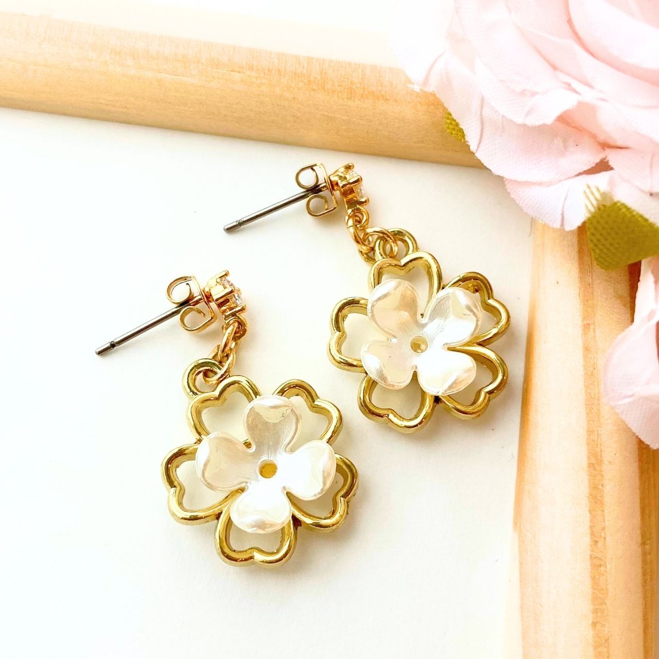 柔らかなパールの花びらと、繊細なゴールドフレームが上品なフラワーピアス。