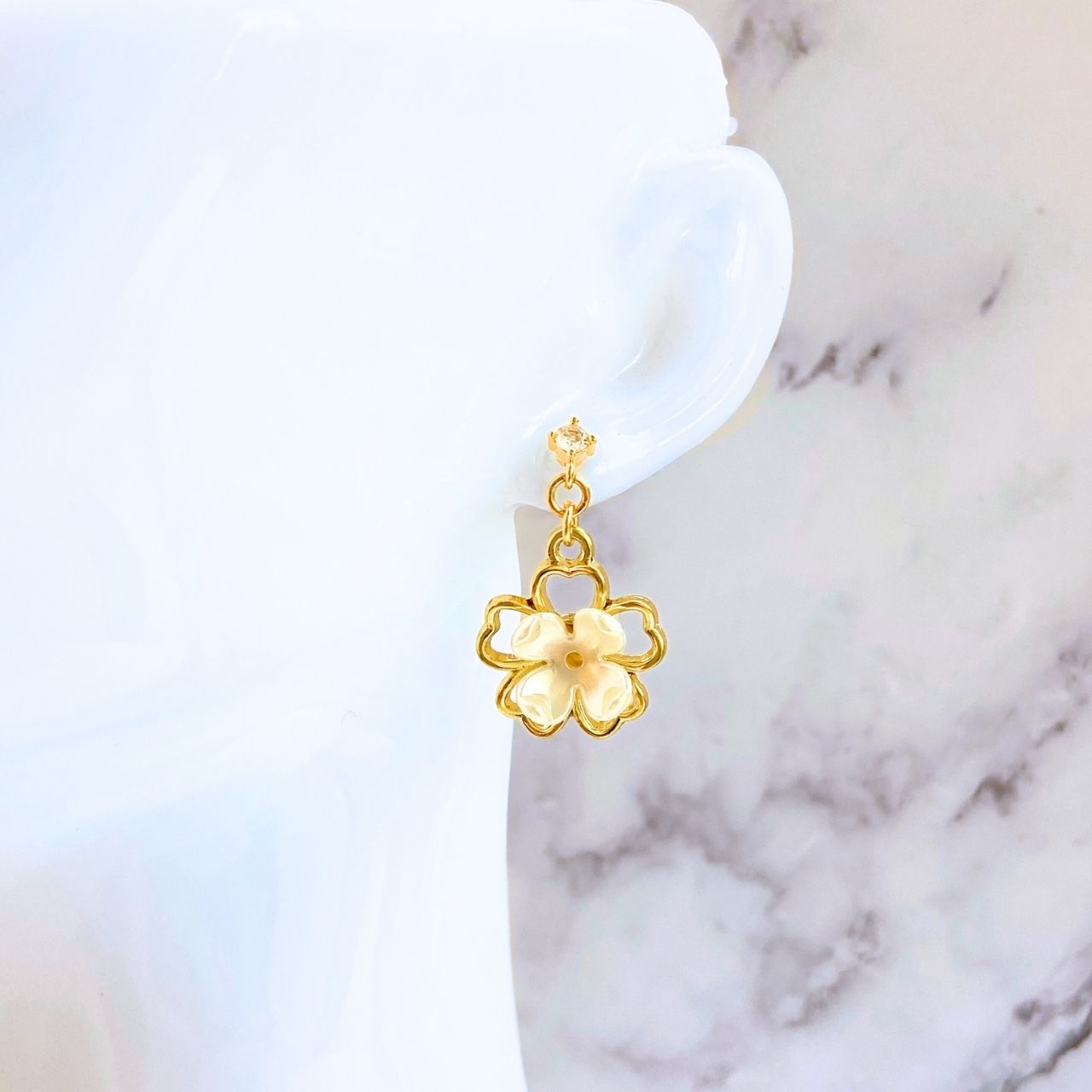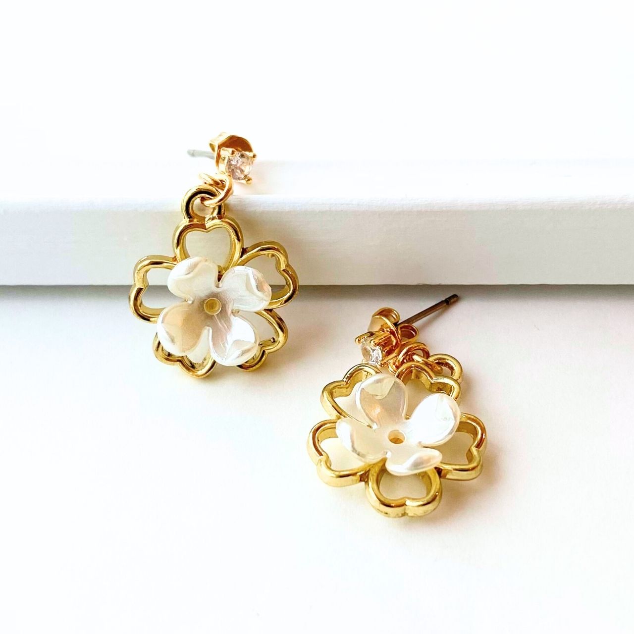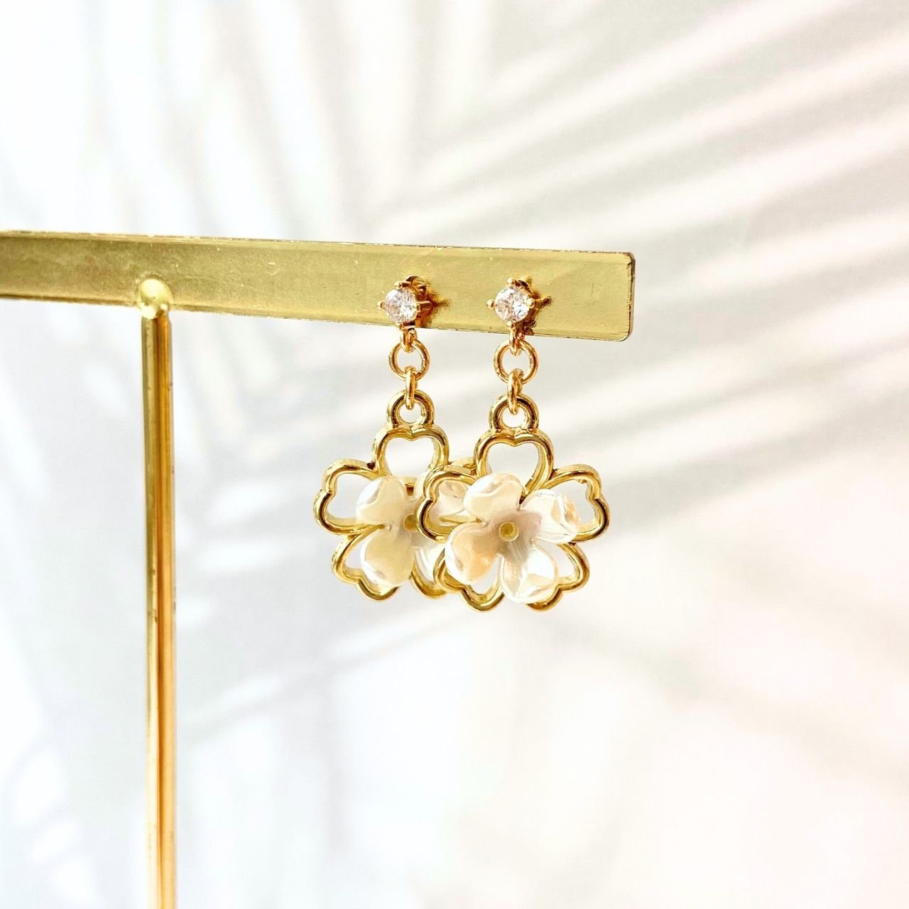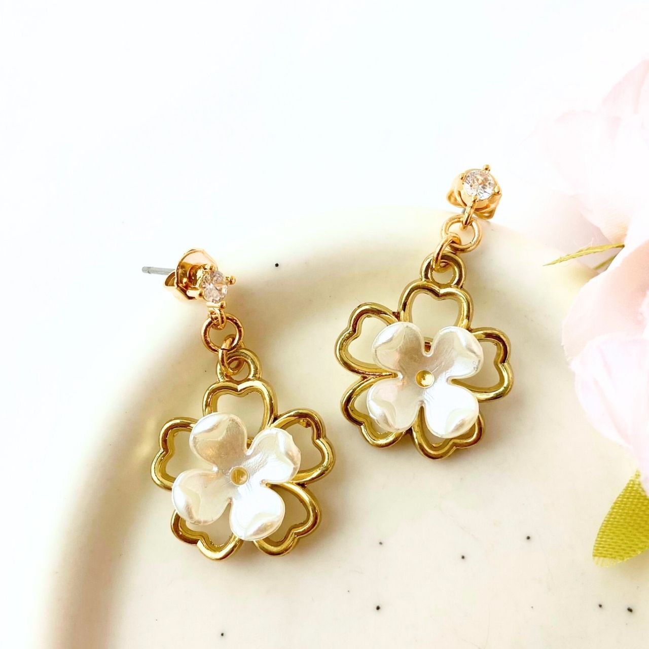 柔らかなパールの花びらと、繊細なゴールドフレームが上品なフラワーピアス。