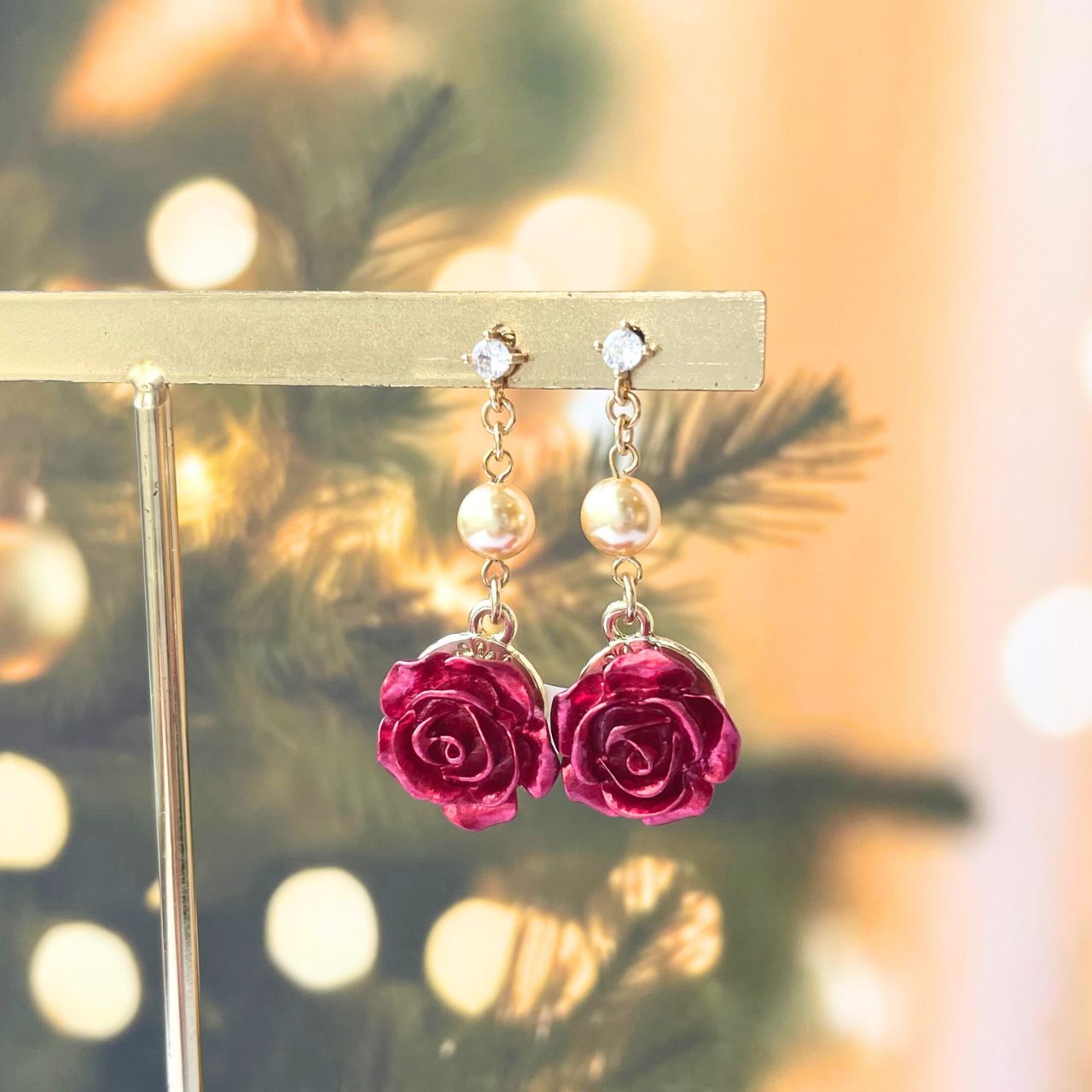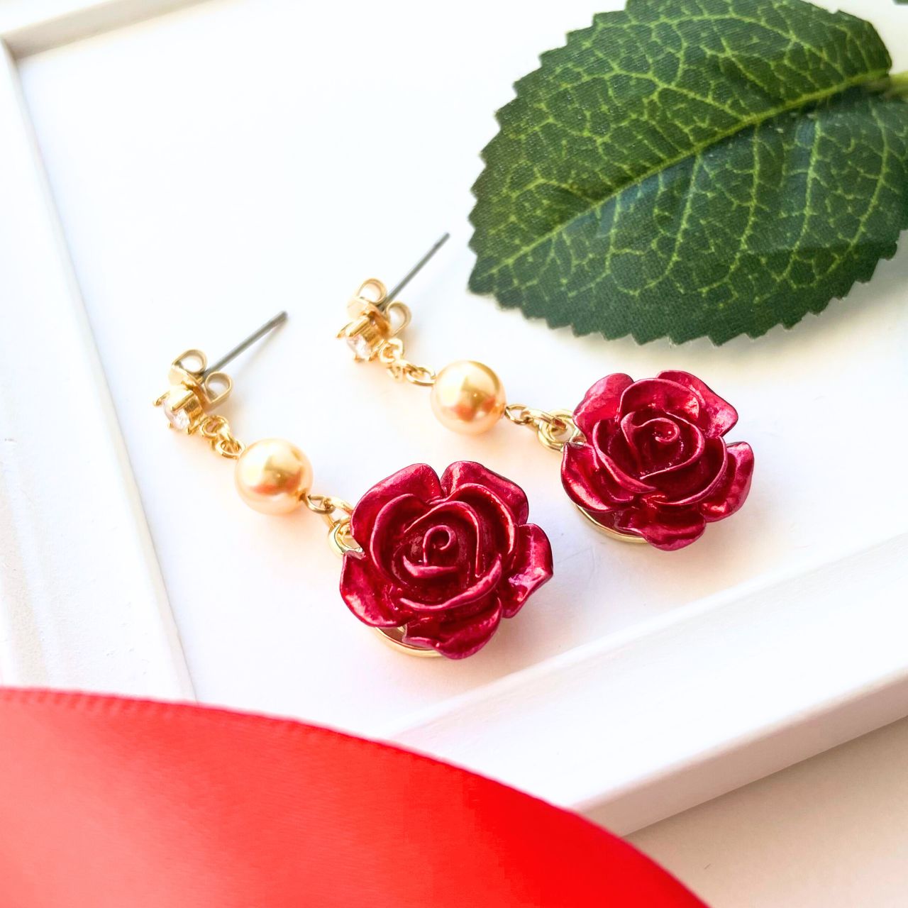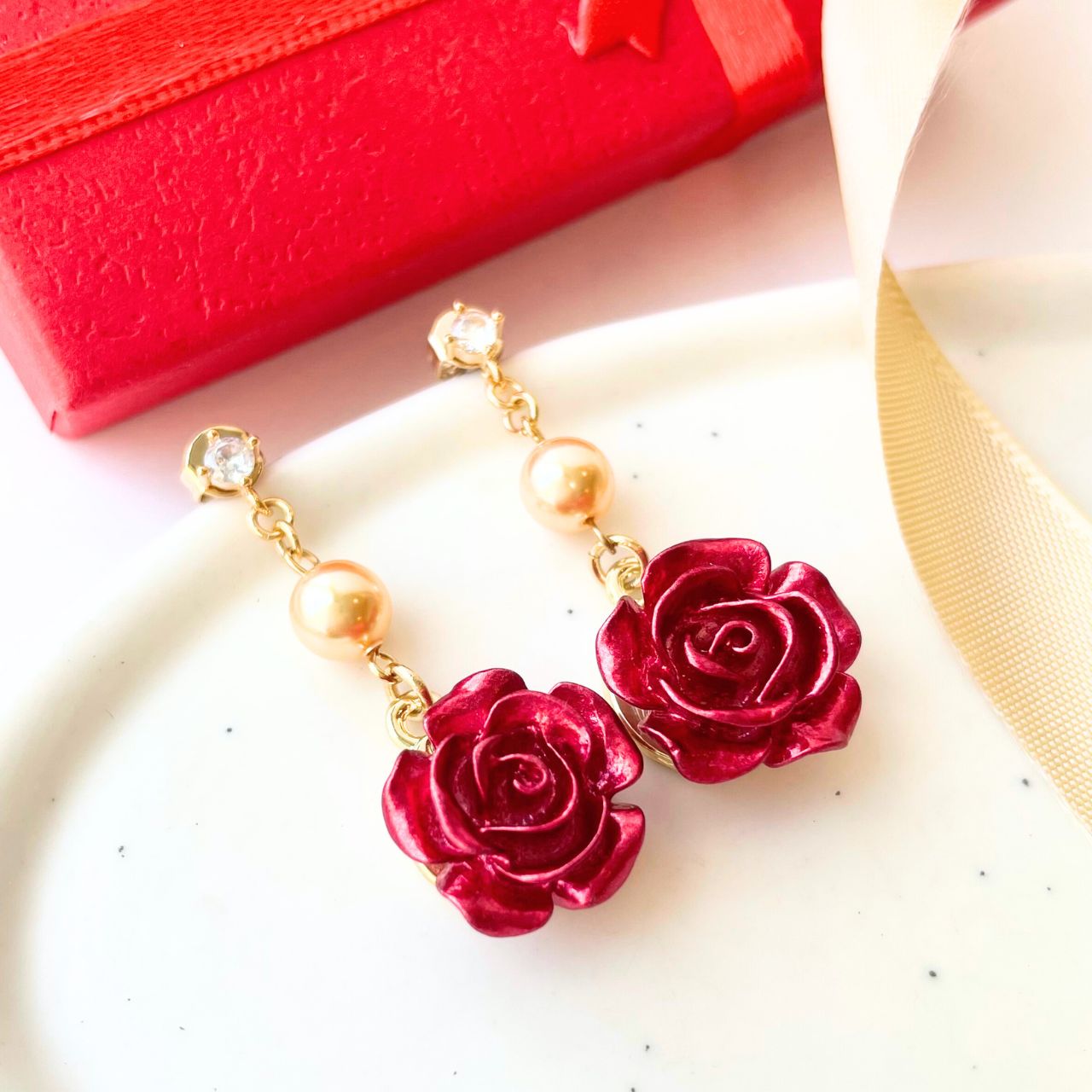 深みのあるレッドローズが耳元で上品に揺れ、顔周りの印象を一瞬で華やかに引き上げます。
