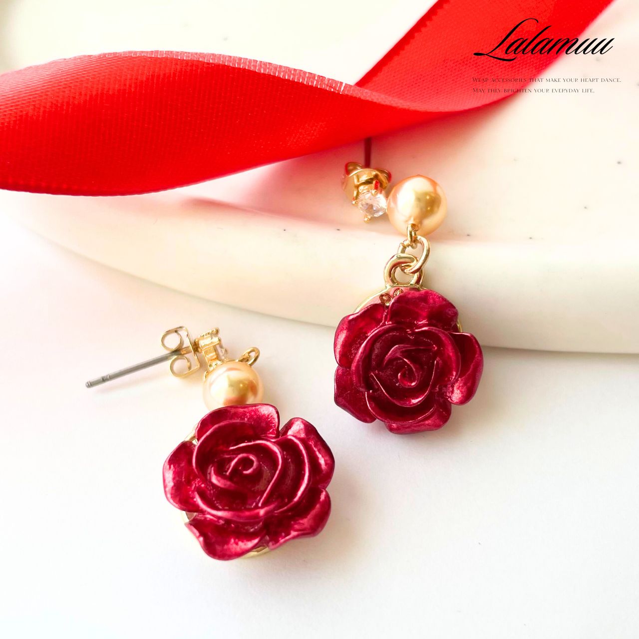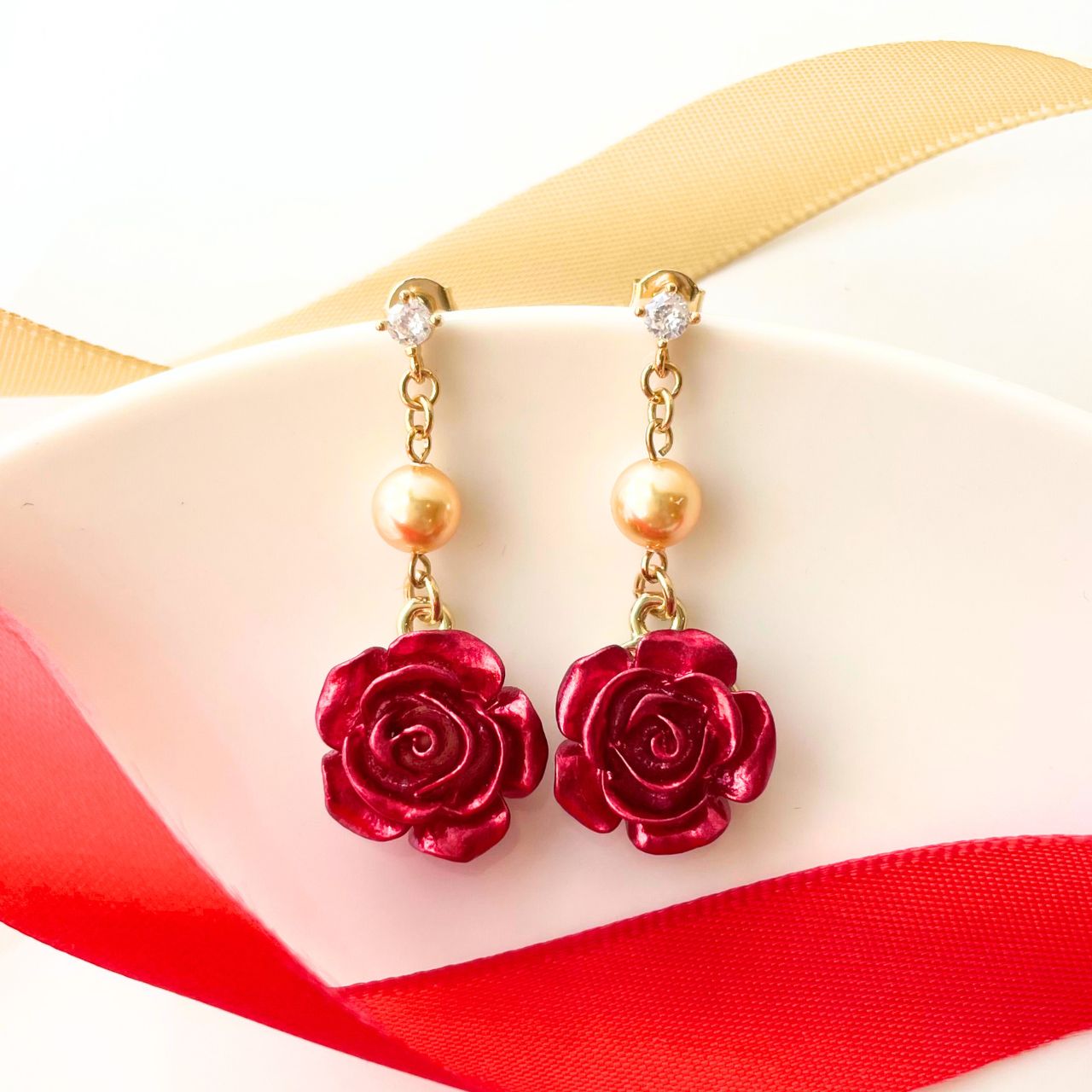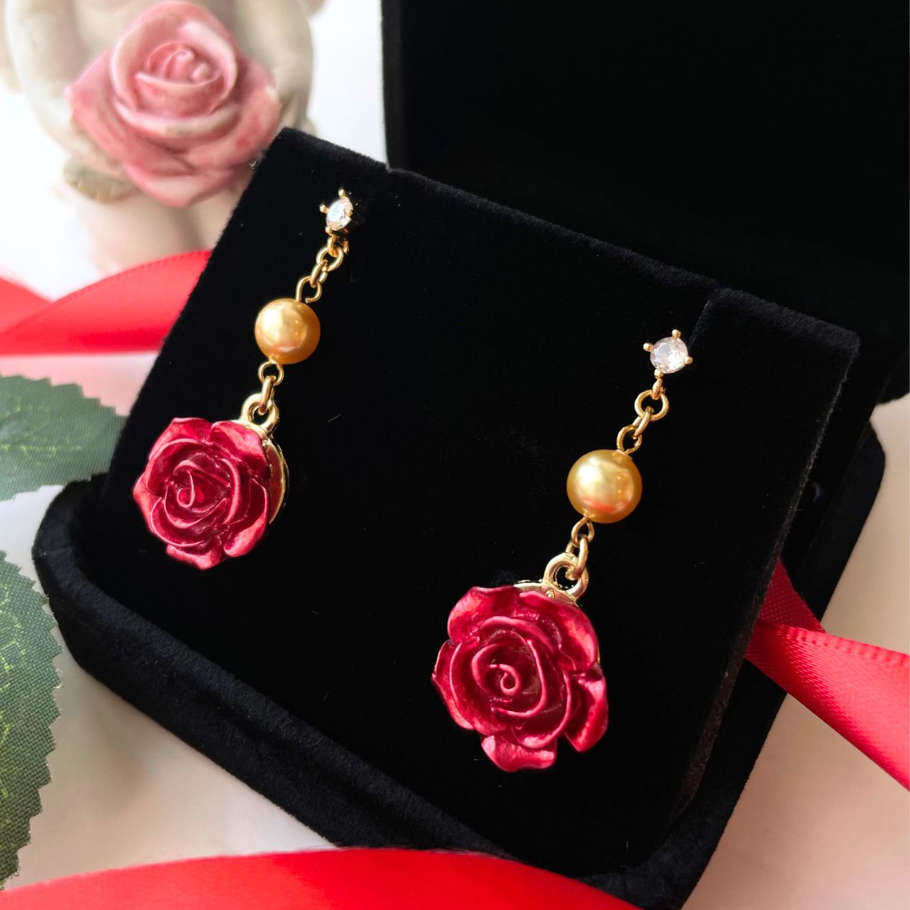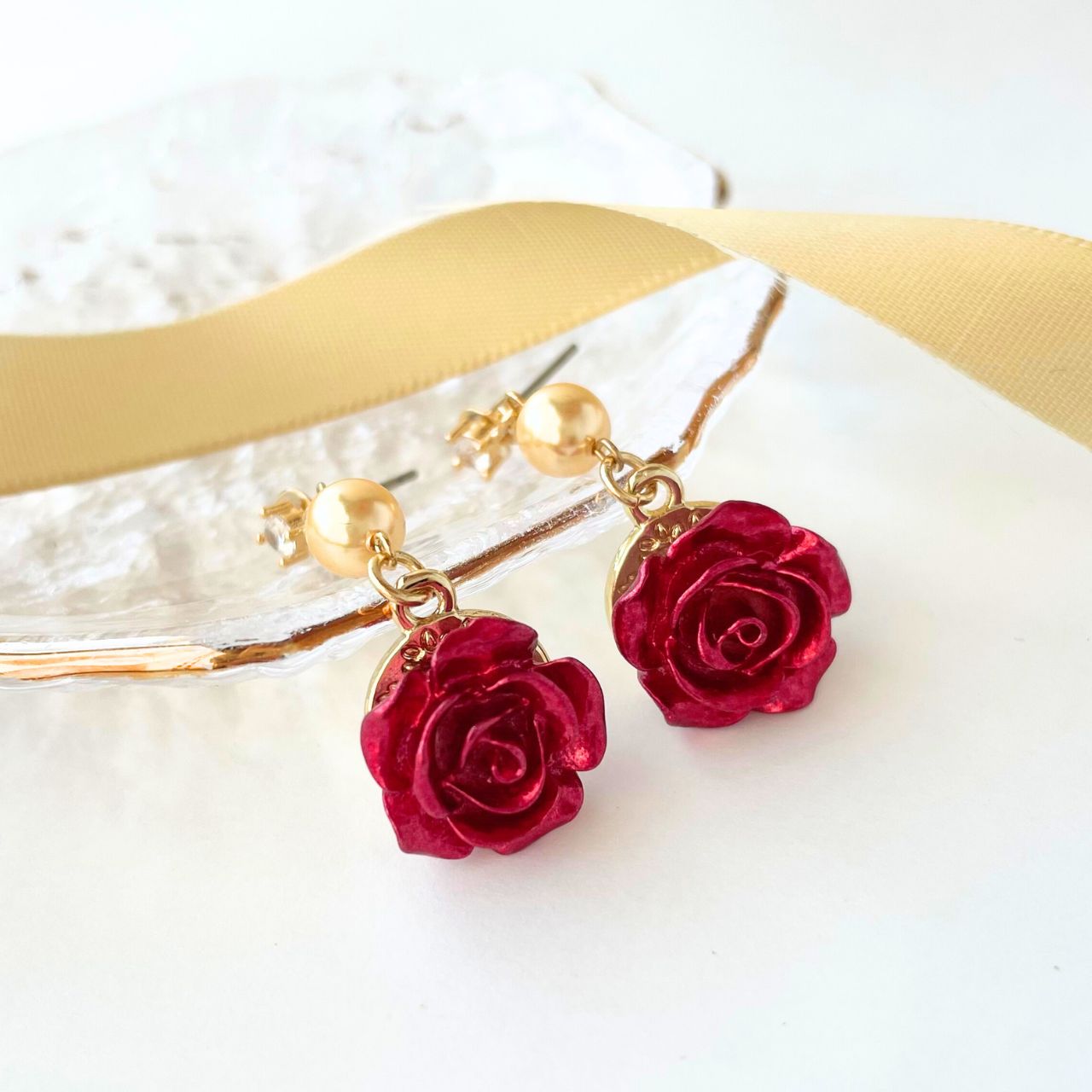 深みのあるレッドローズが耳元で上品に揺れ、顔周りの印象を一瞬で華やかに引き上げます。