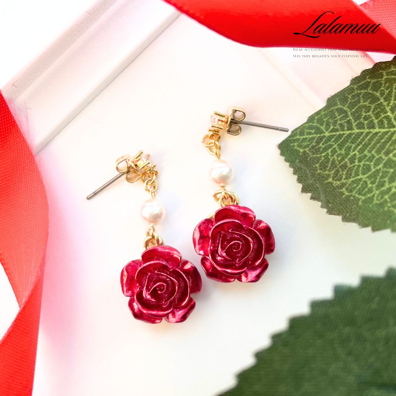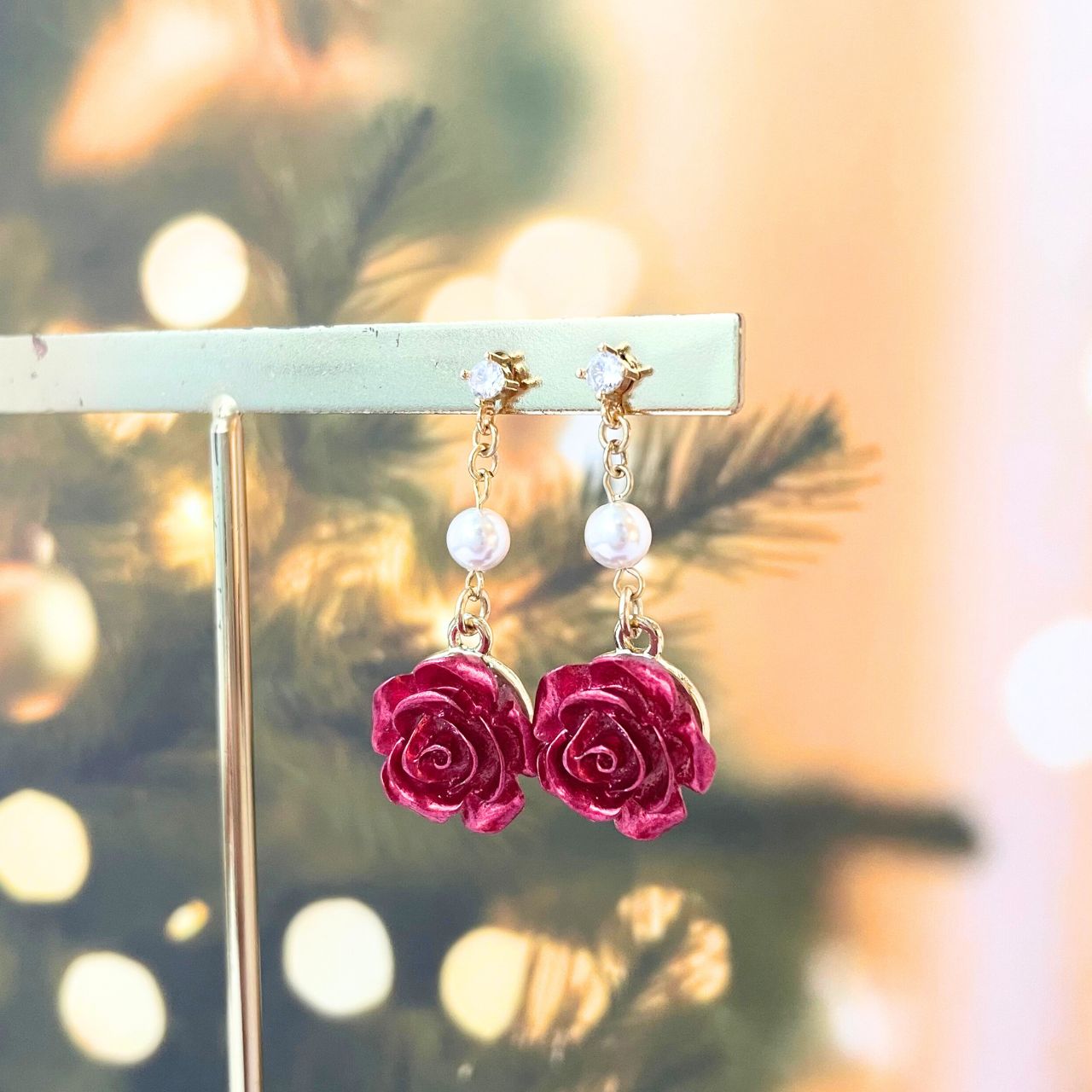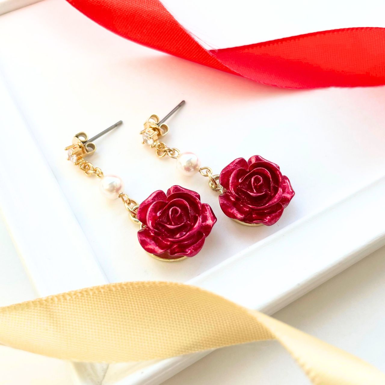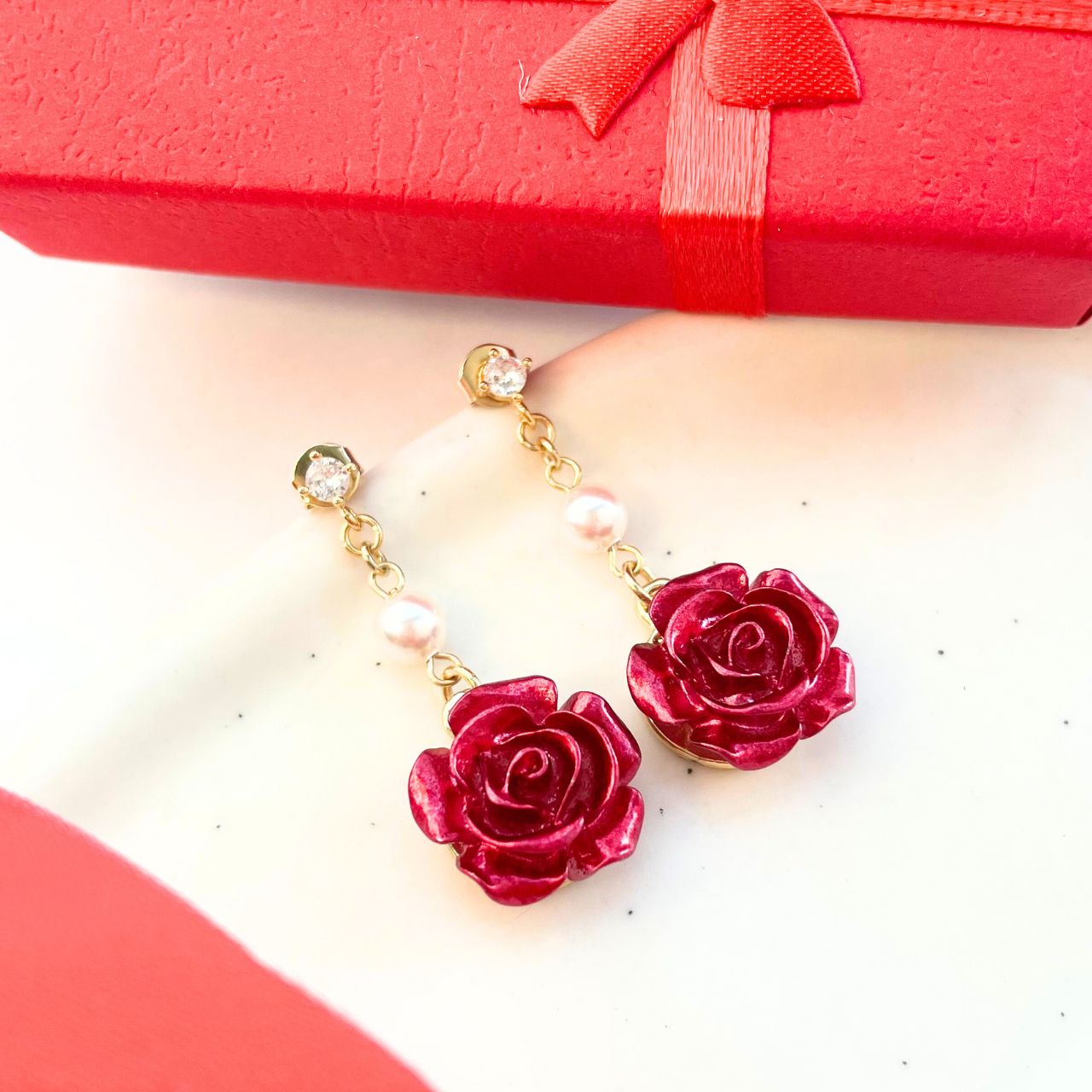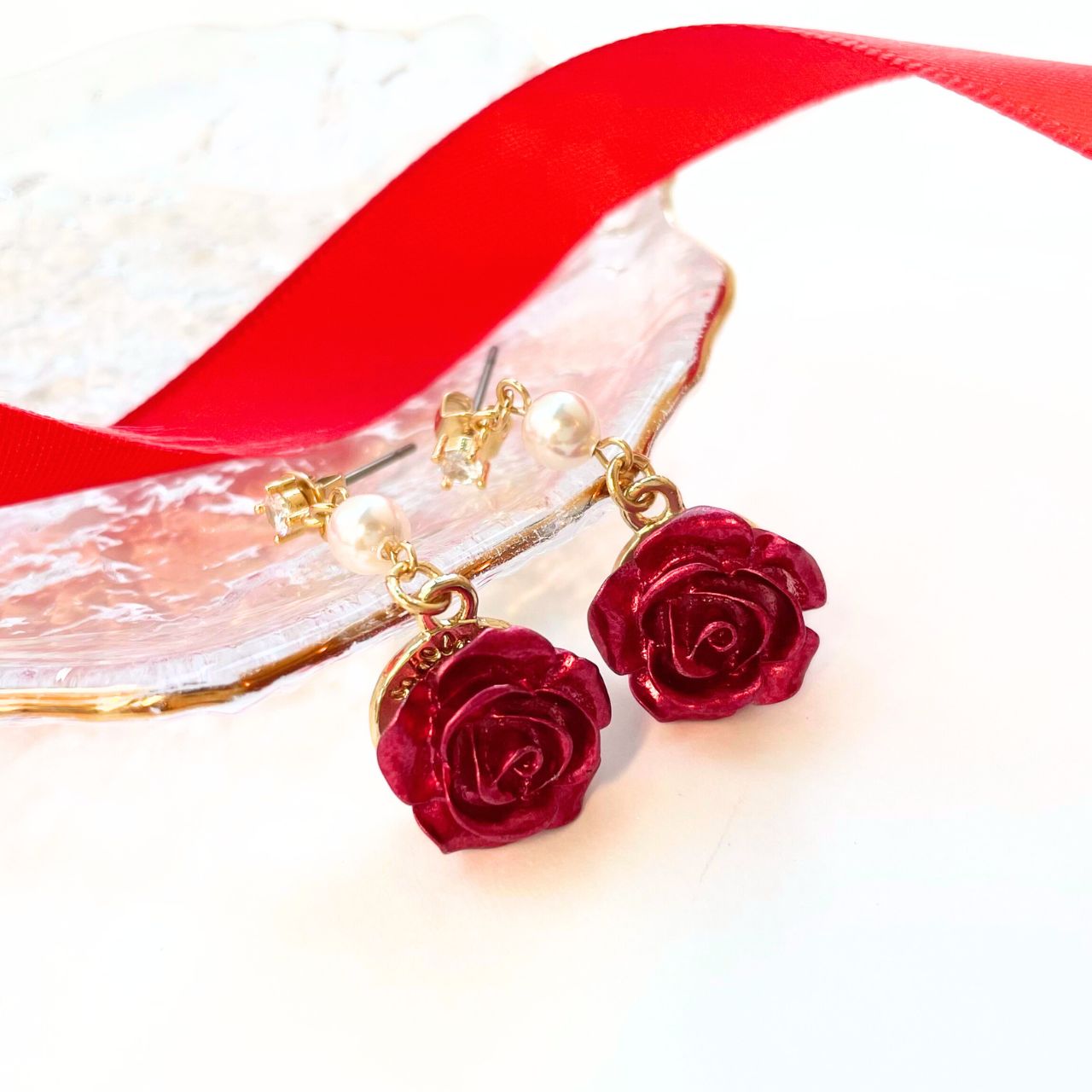 バラは「愛」「美」「尊敬」「感謝」を象徴する花。耳元で揺れるローズに、