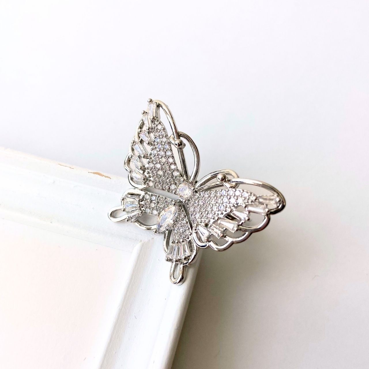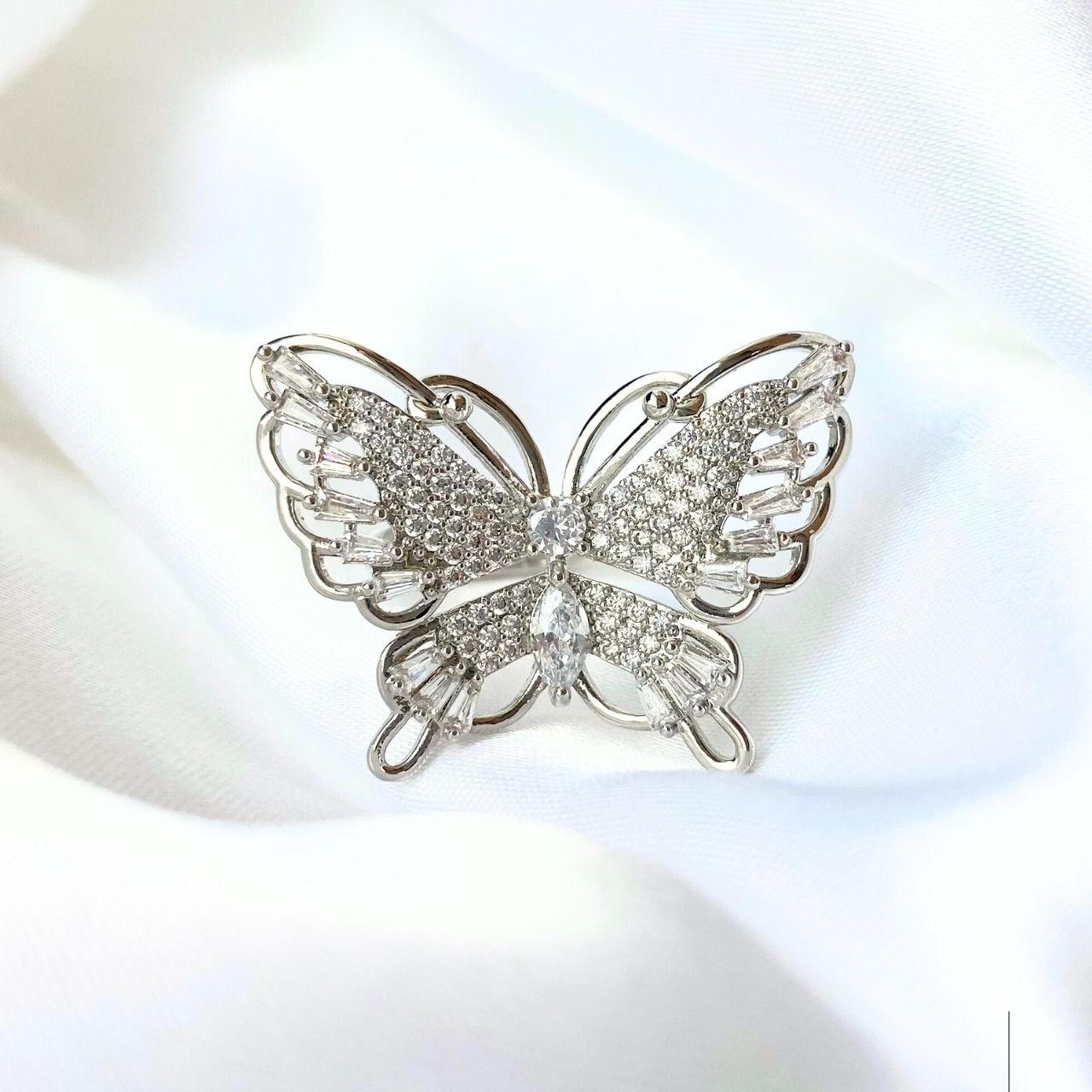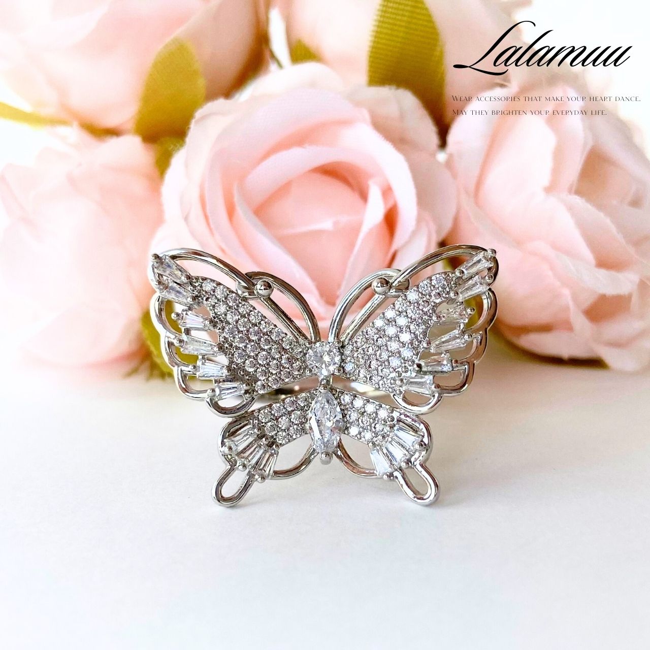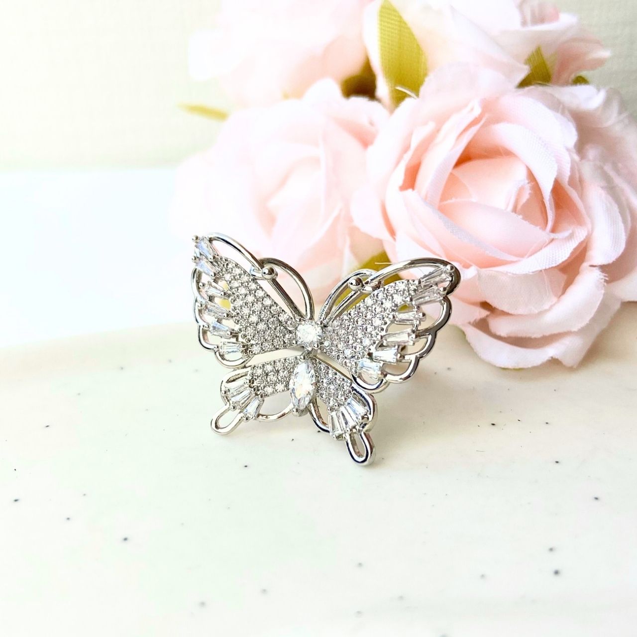 憐さとラグジュアリーを一つに。立体的に広がる蝶モチーフに、繊細なジルコニアを贅沢にあしらった存在感のあるデザイン。角度によって表情を変える華やかさが魅力です。シルバーカラーの艶めきが肌のトーンを明るく見せ、デイリーのワンポイントからドレスアップまで幅広く活躍。自分へのご褒美は