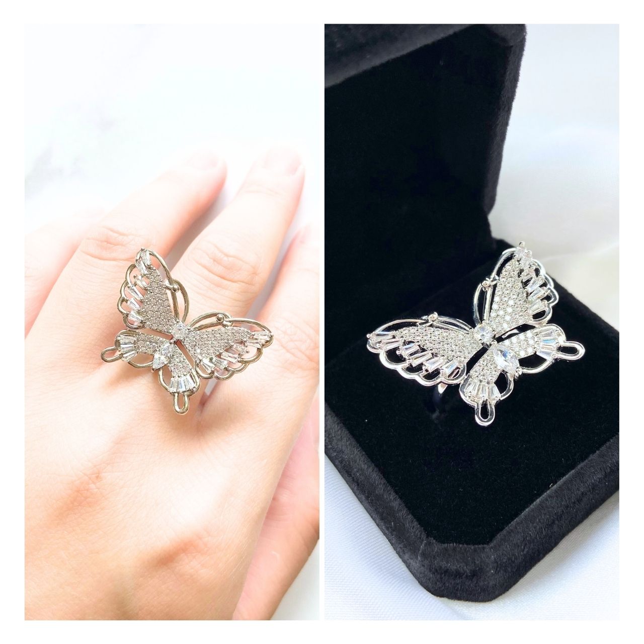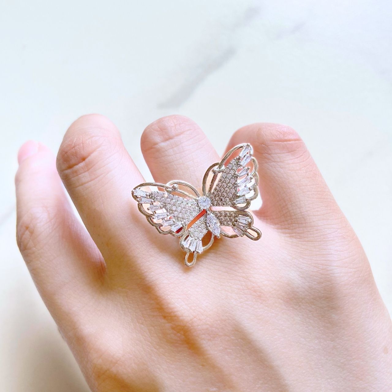 繊細にデザインされた蝶のシルエットは、優雅さと可憐さをあわせ持ち、指先に軽やかな印象を添えます。