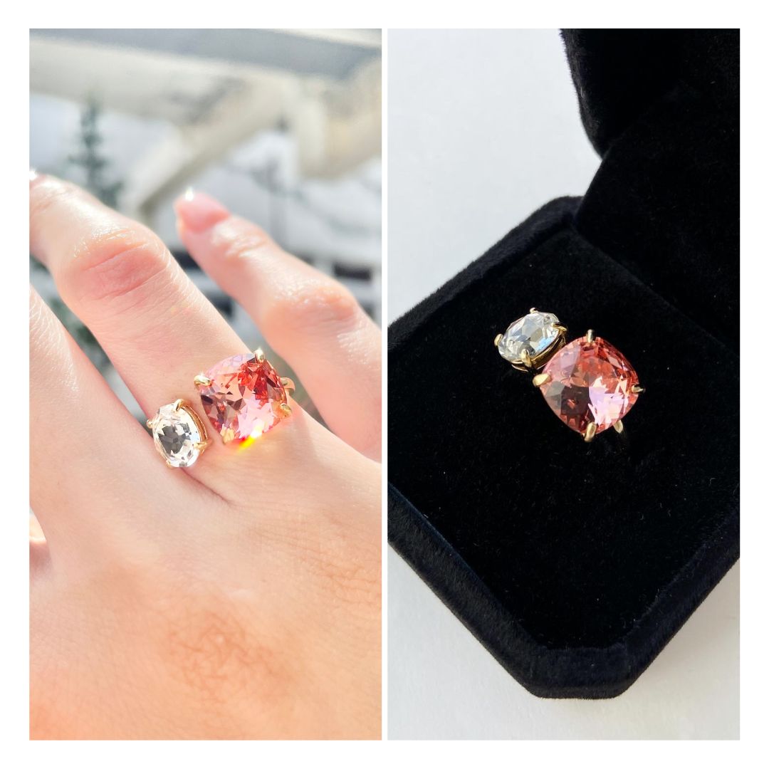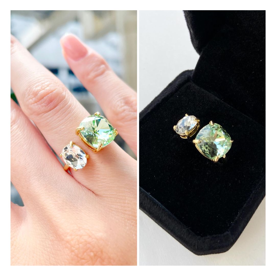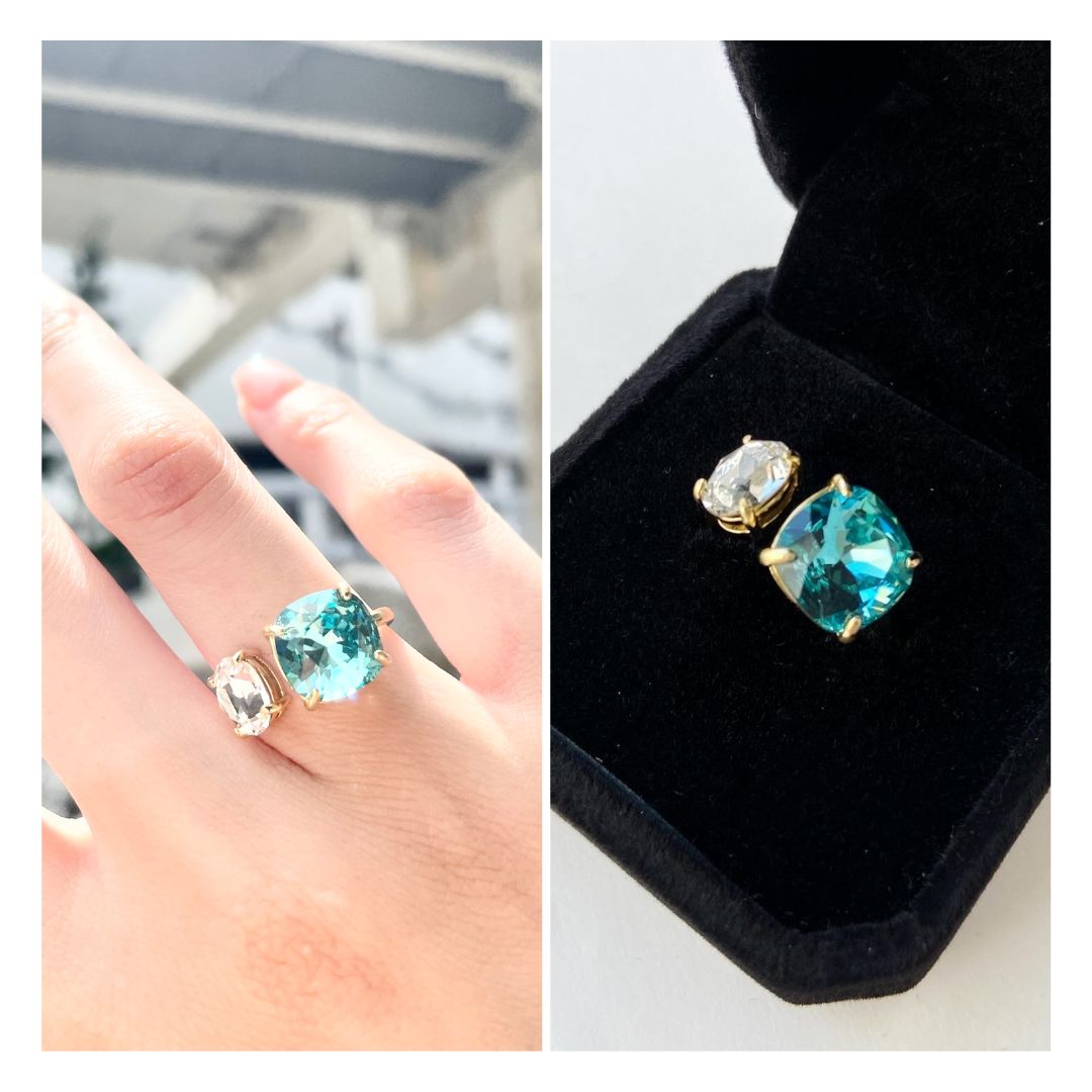 透け感のあるストーンで、身に付けていても重い印象にならず、 爽やかで着け心地の良いリングです