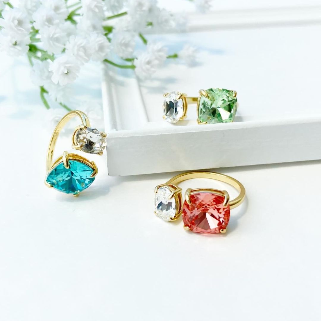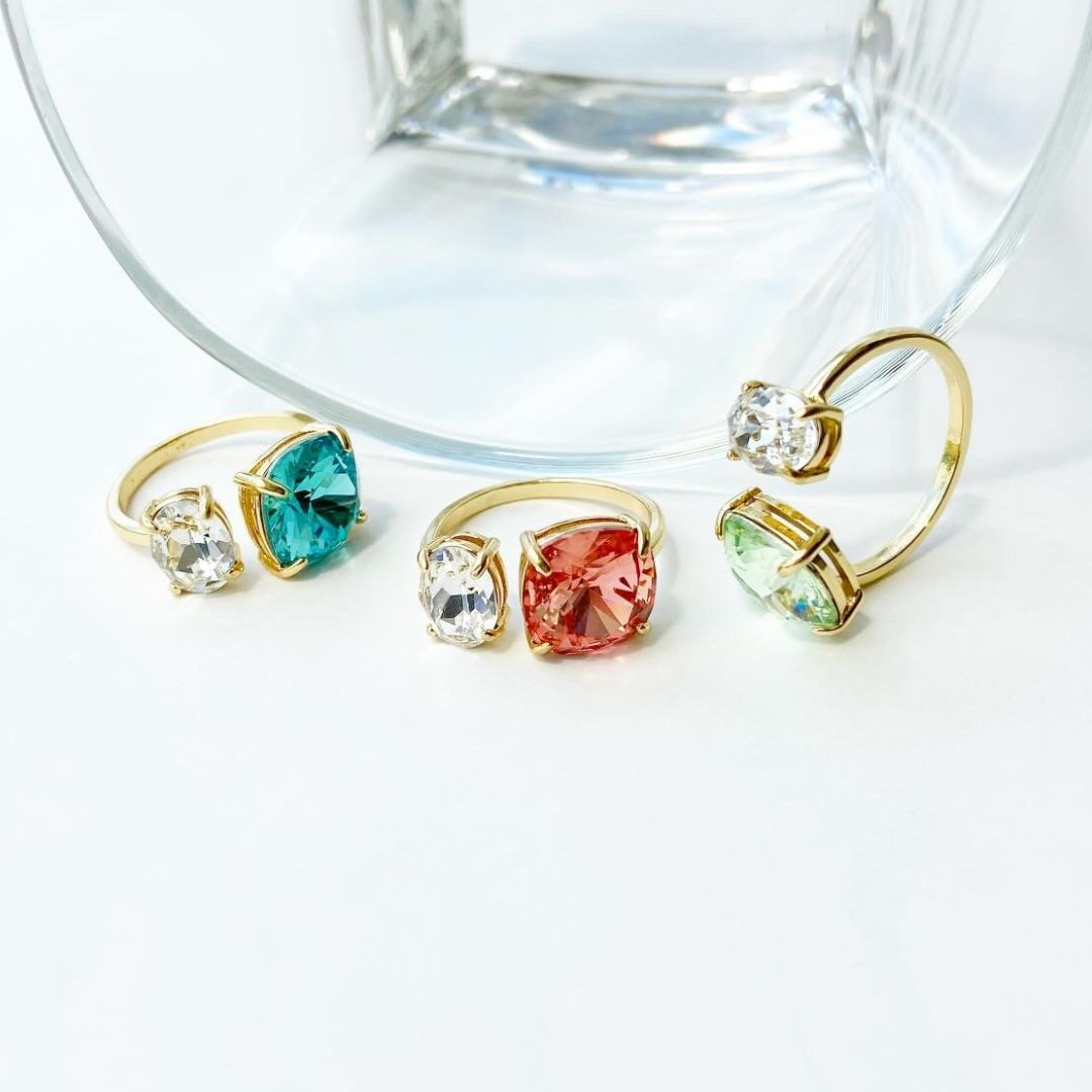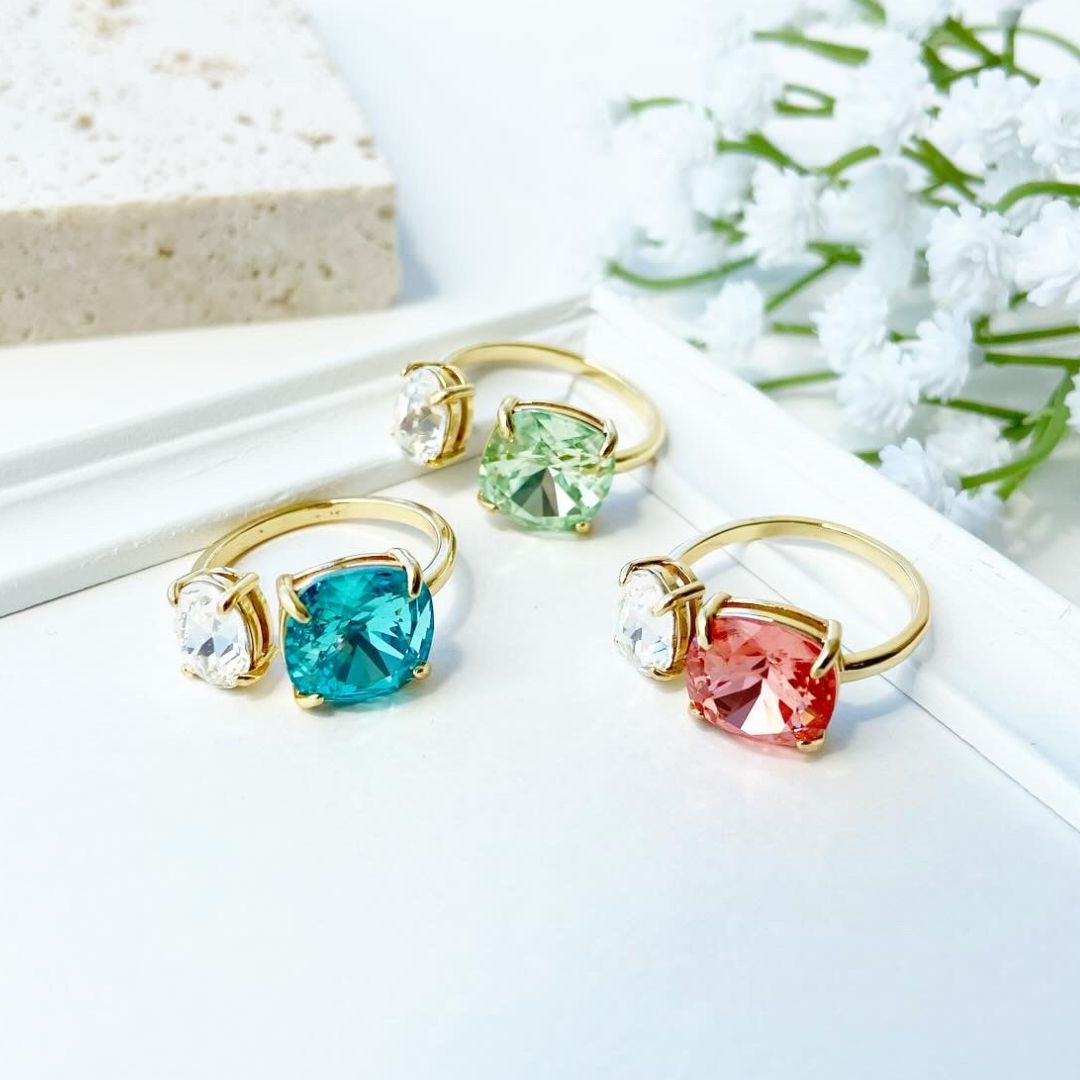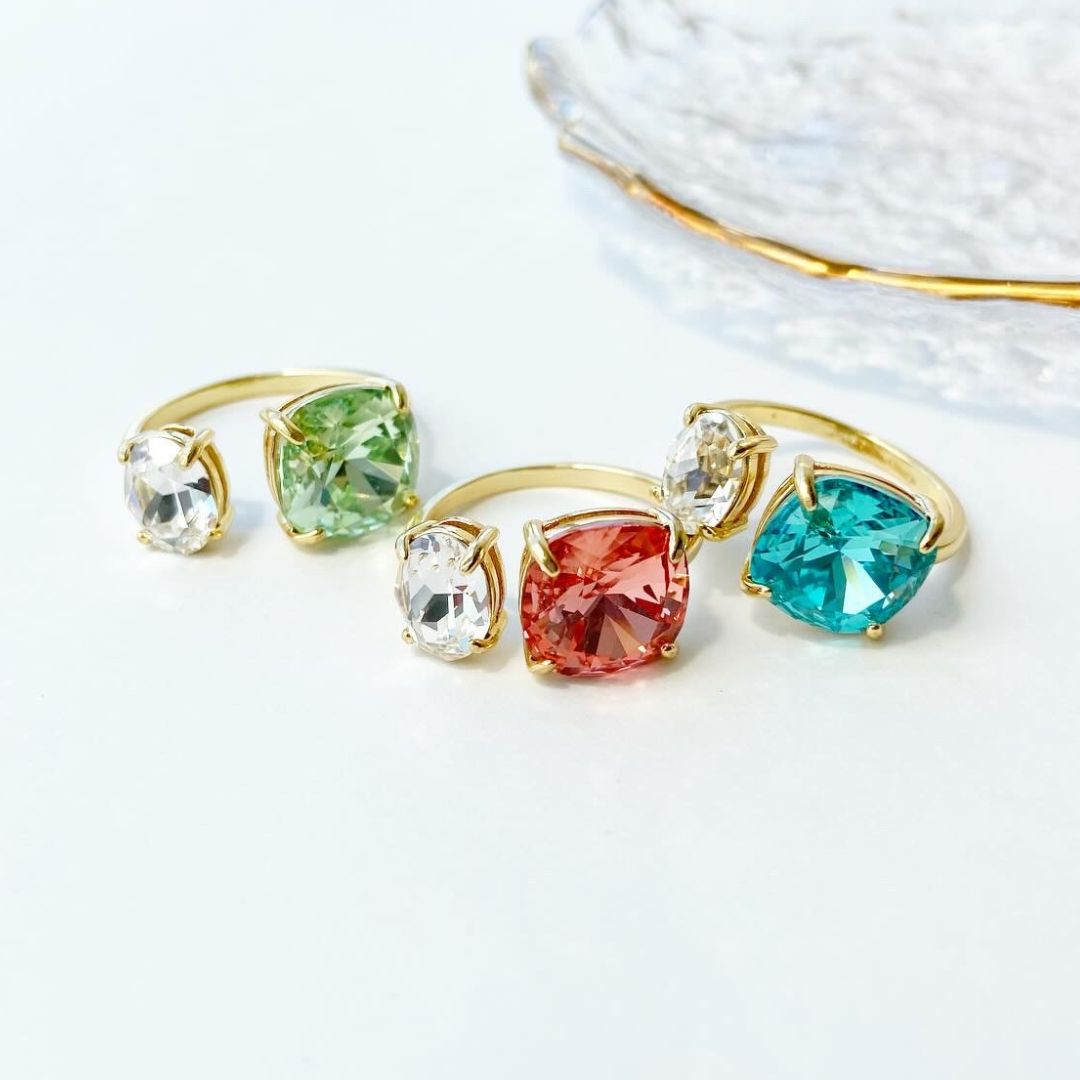 透け感のあるストーンで、身に付けていても重い印象にならず、 爽やかで着け心地の良いリングです