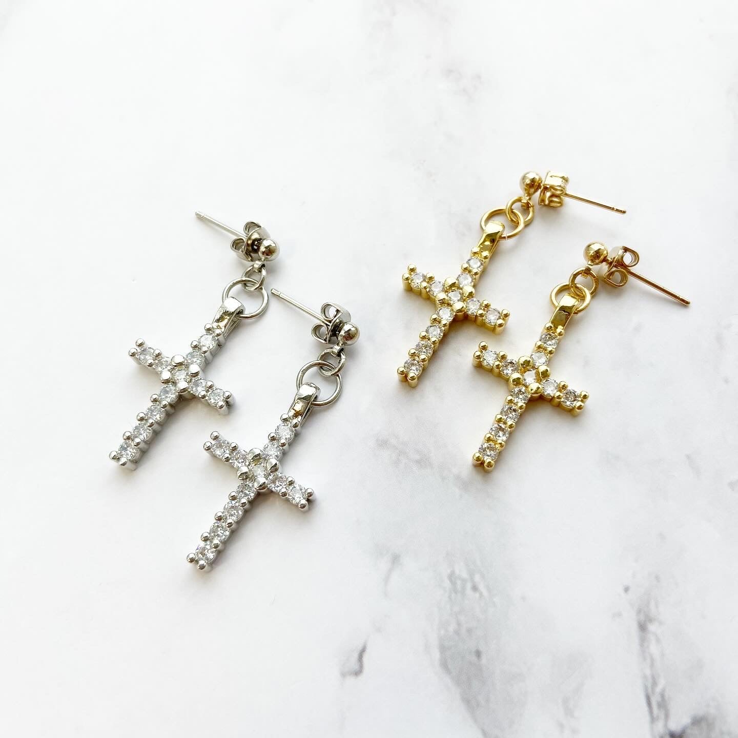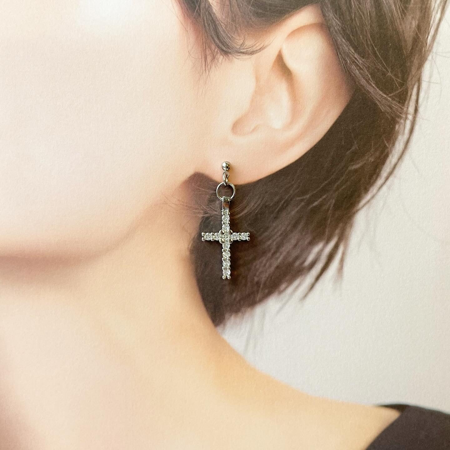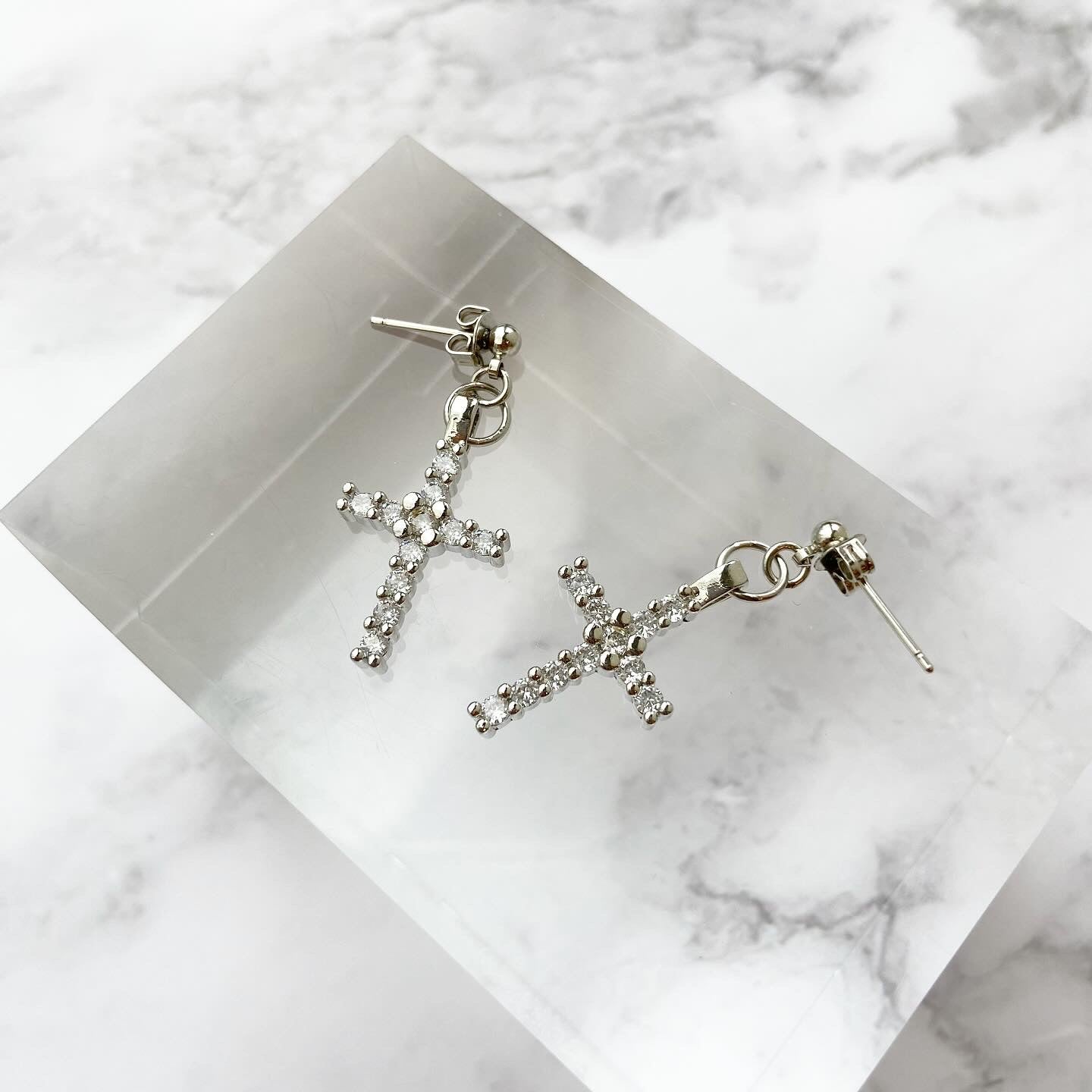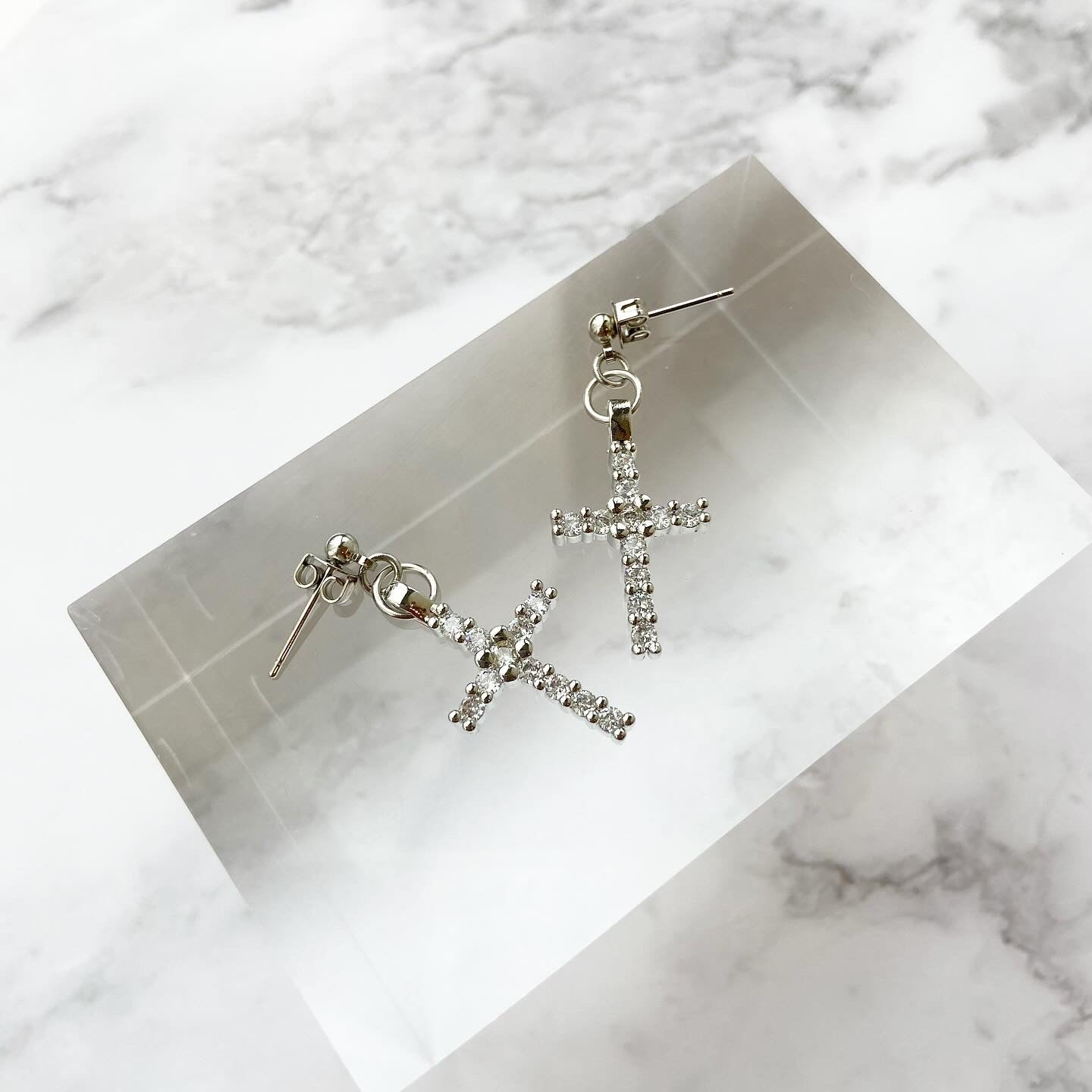 透明感と上品な輝きが特徴のジルコニアを使ったクロスピアスでございます。