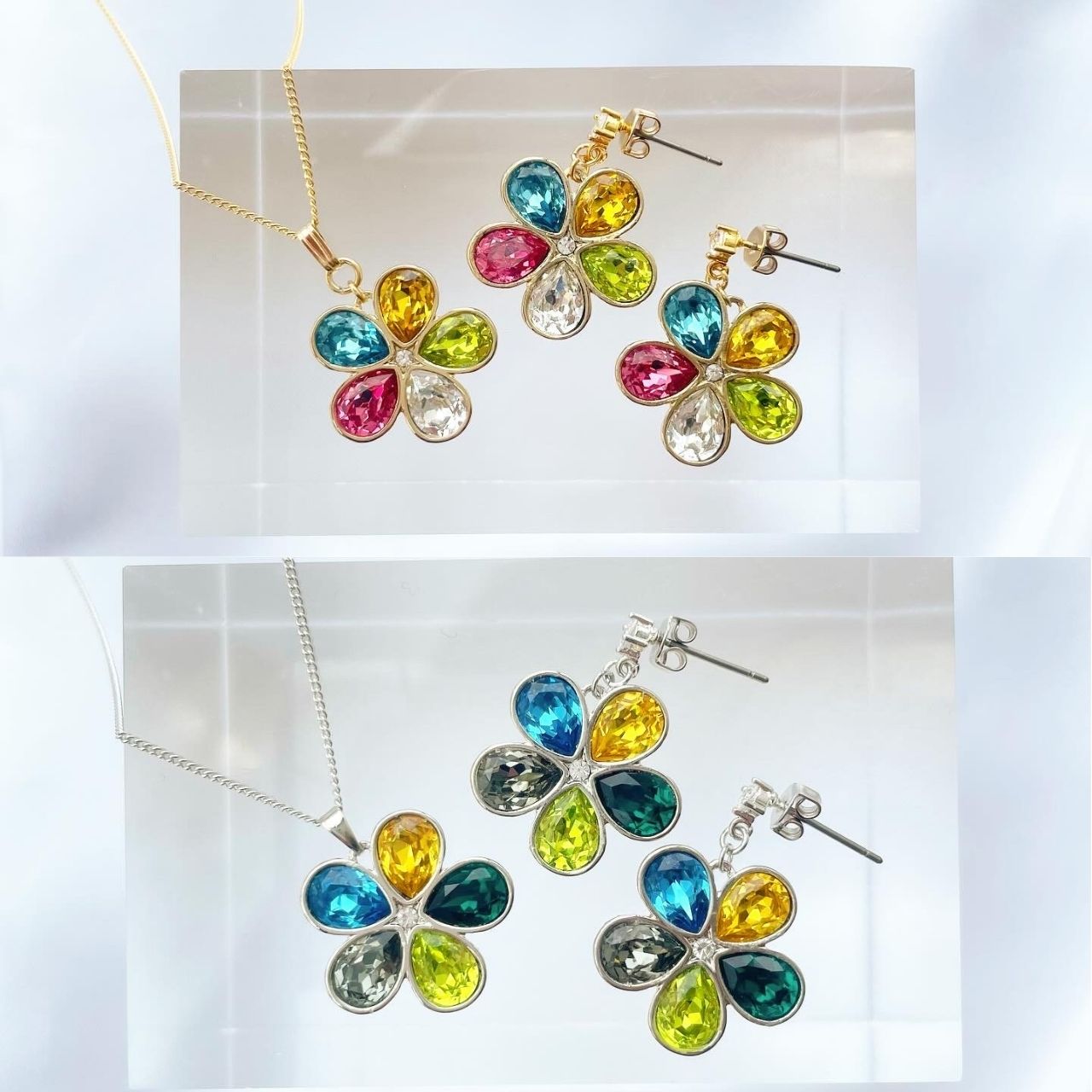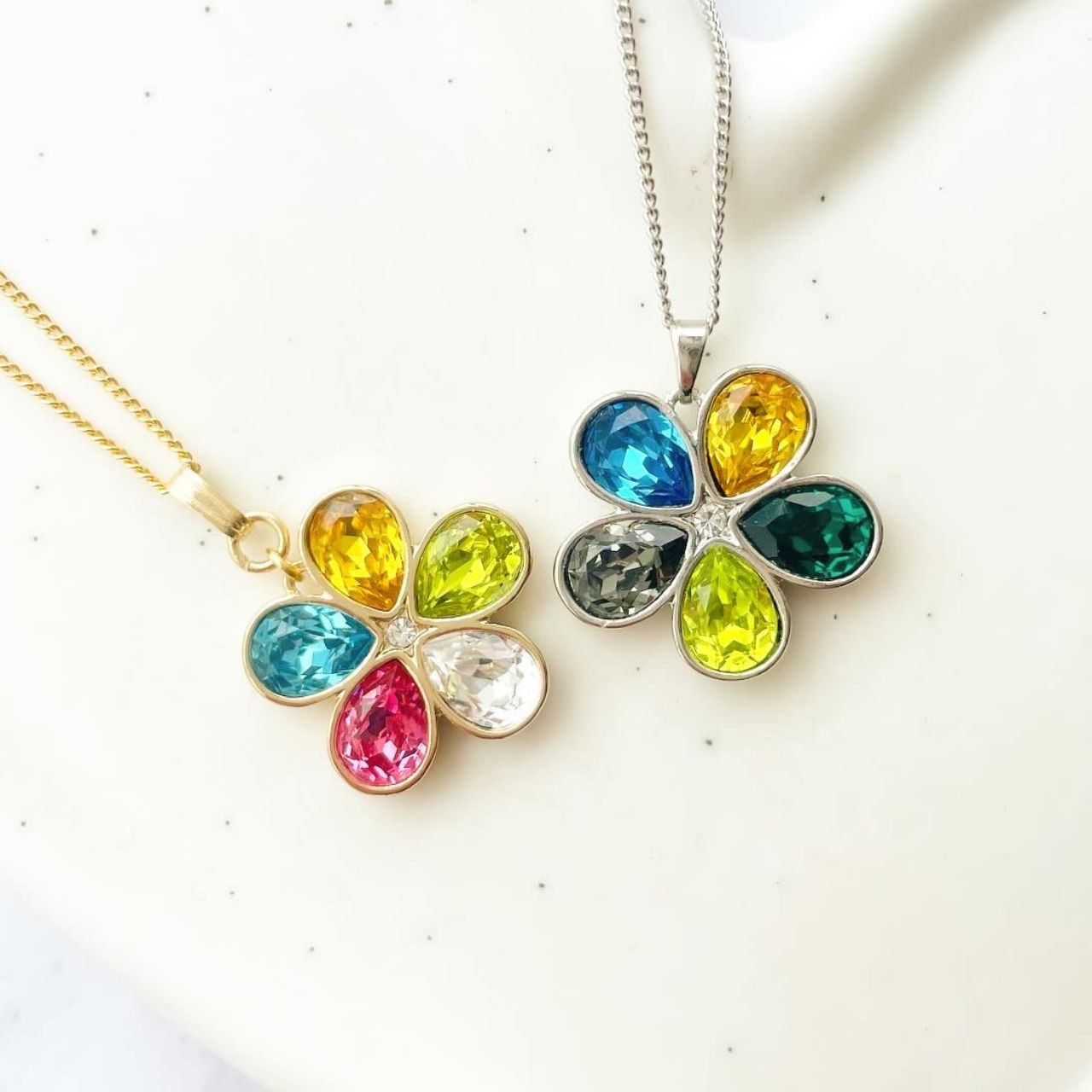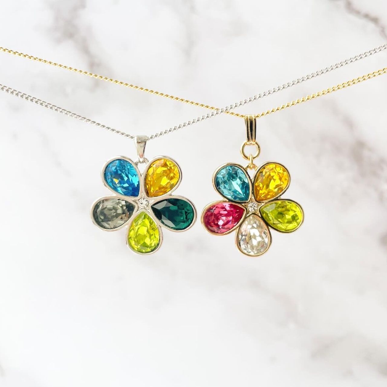 5色のビジューを贅沢に使用したフラワーモチーフのネックレス。