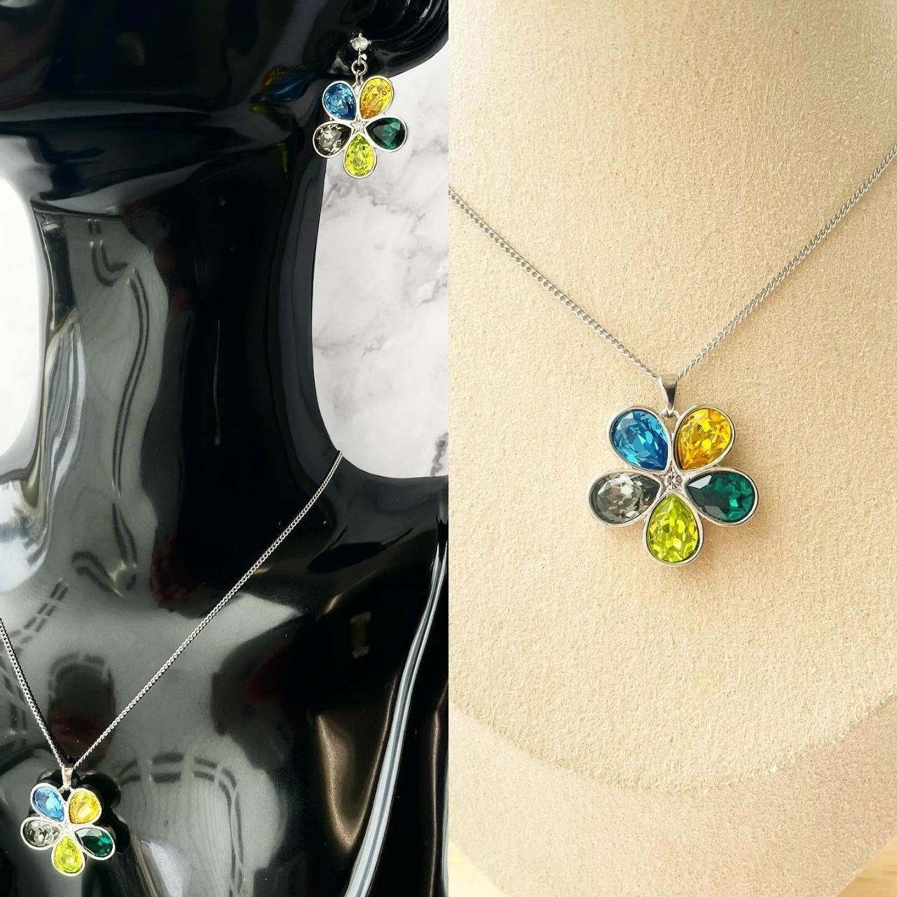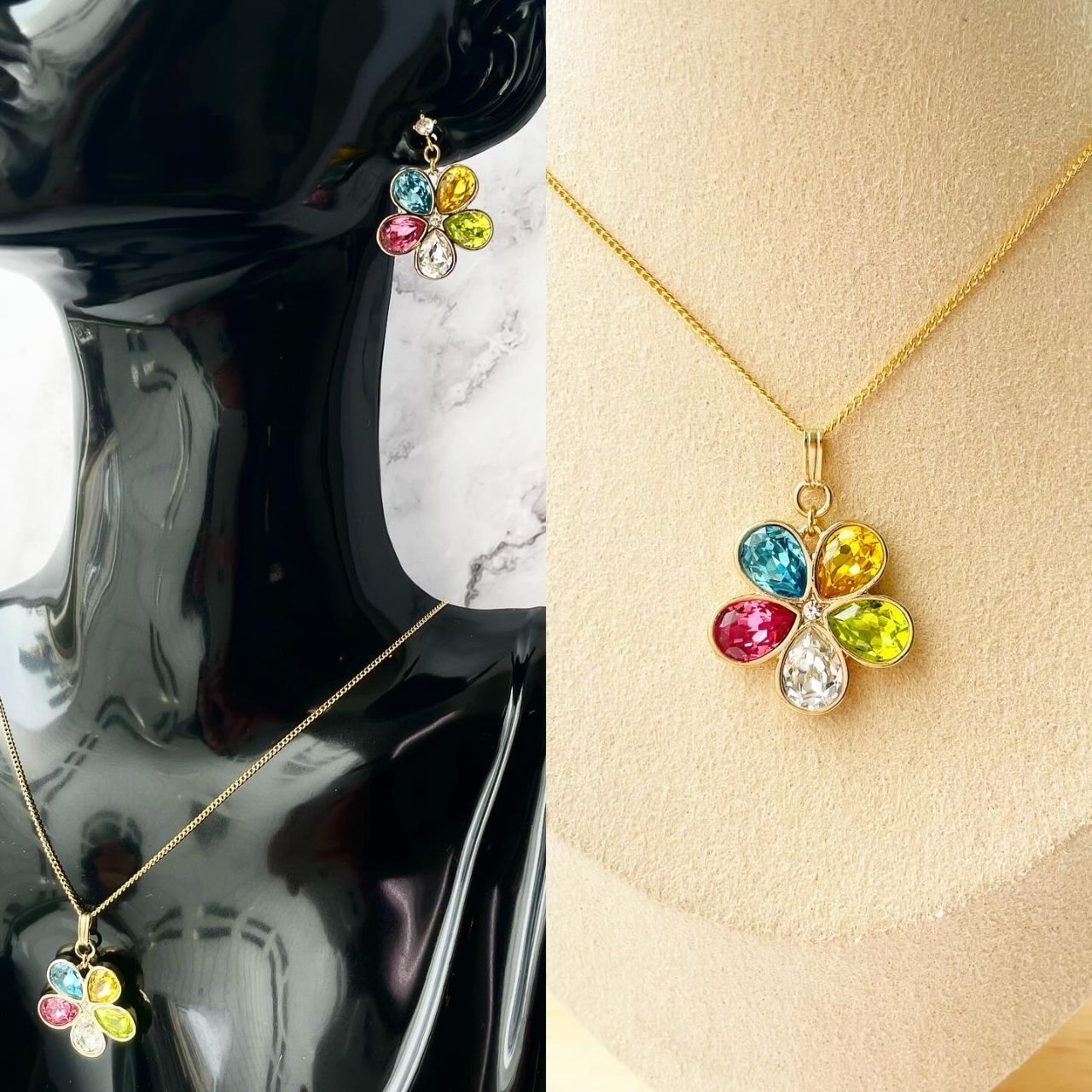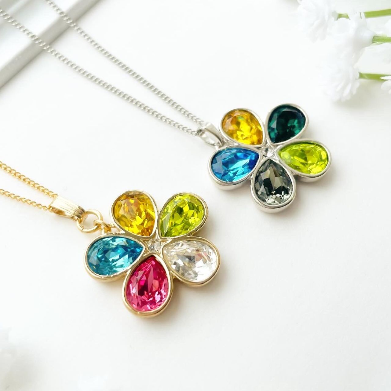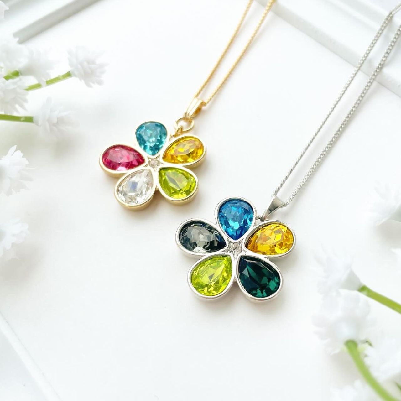 5色のビジューを贅沢に使用したフラワーモチーフのネックレス。