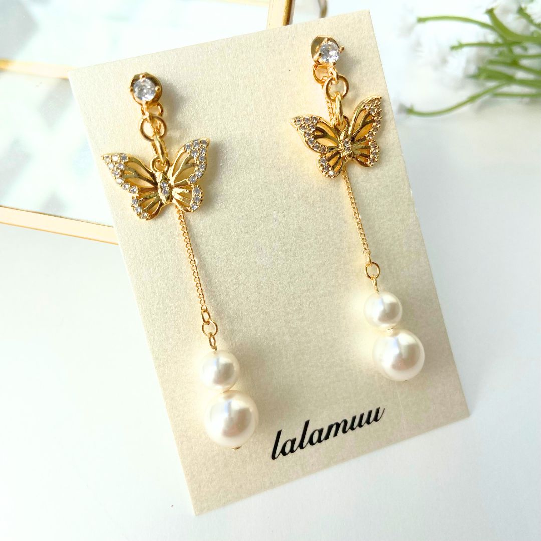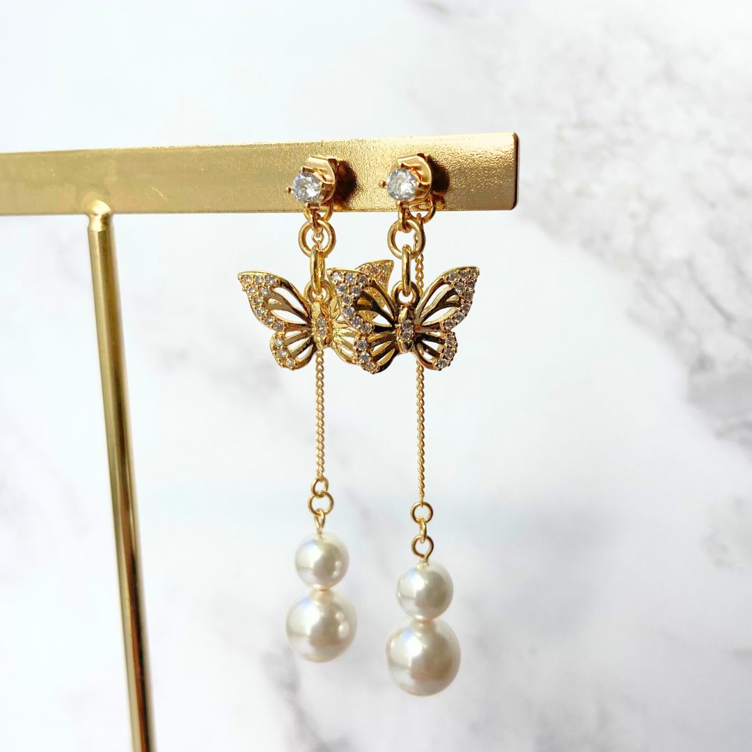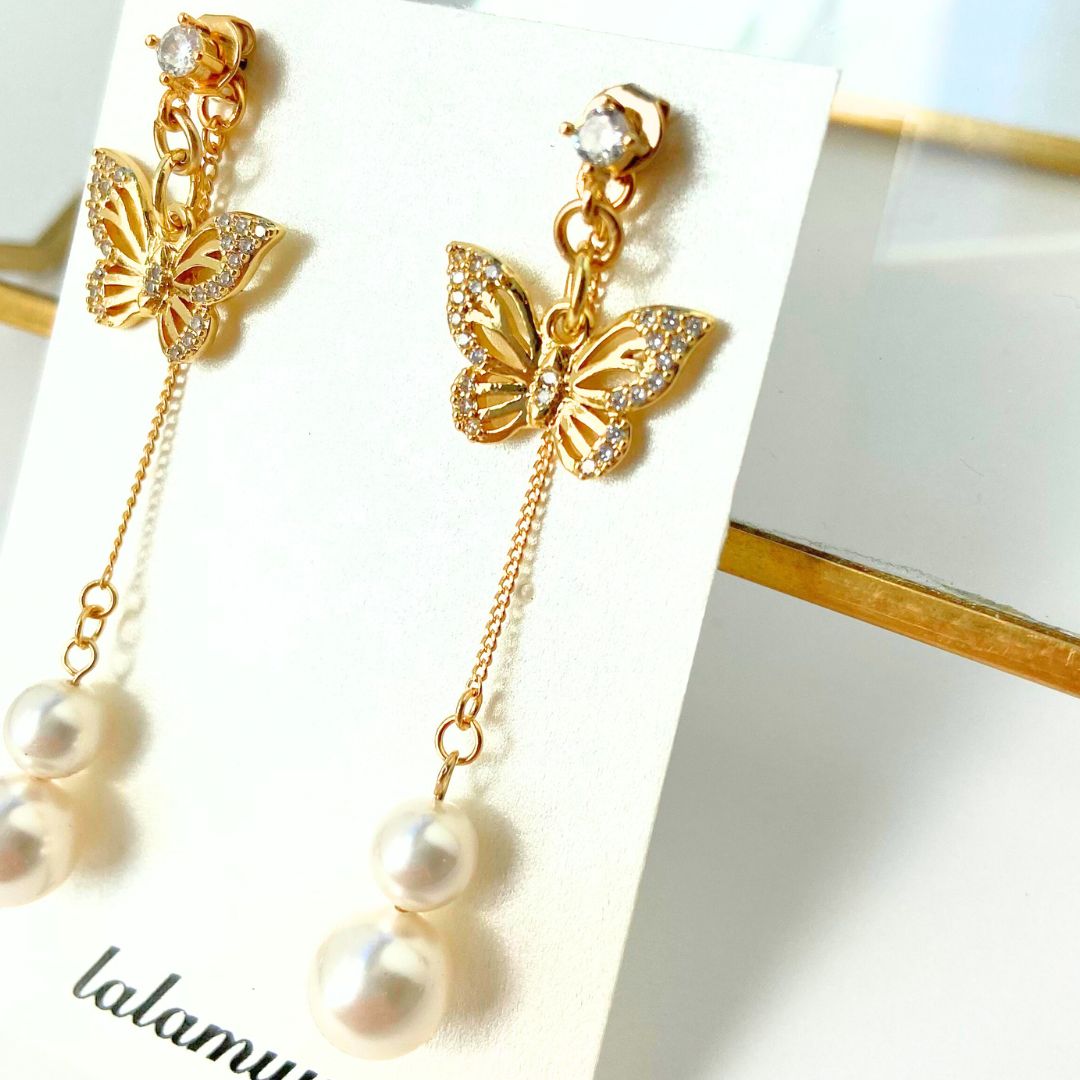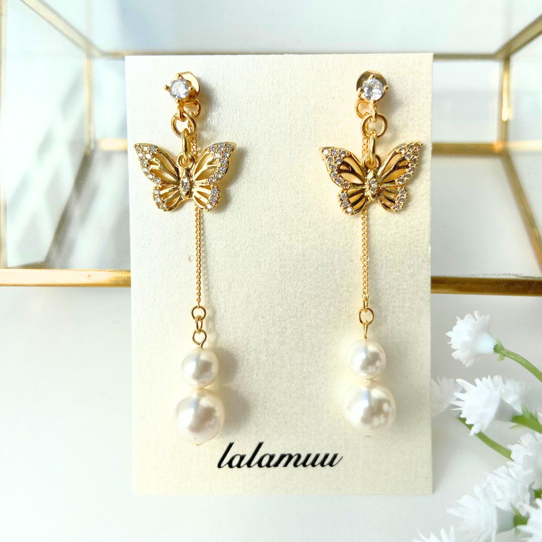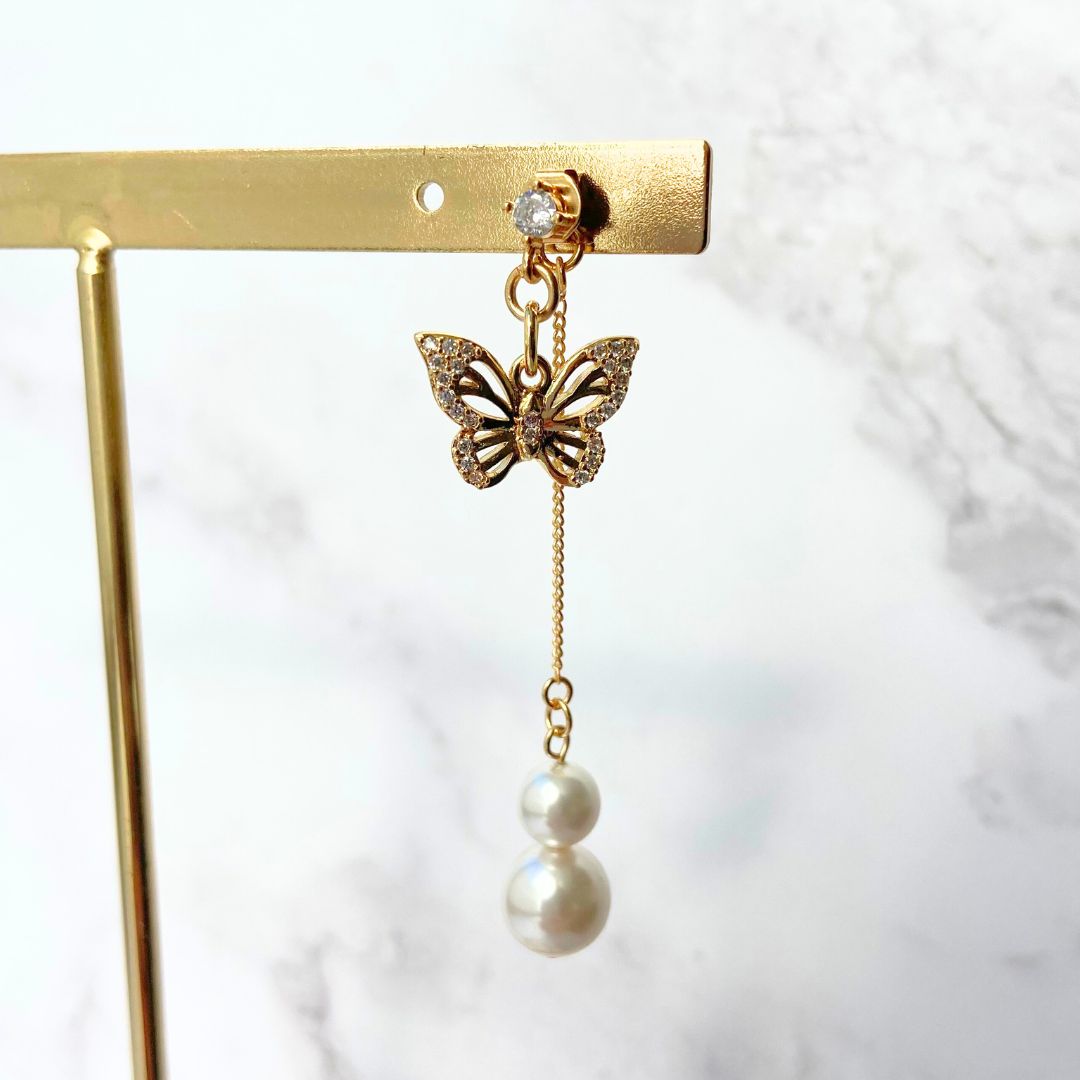 存在感のある2連のパールと、ストーンが敷き詰められたバタフライが耳元を華やかに照らしてくれるデザイン♪