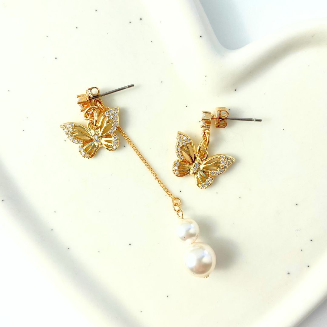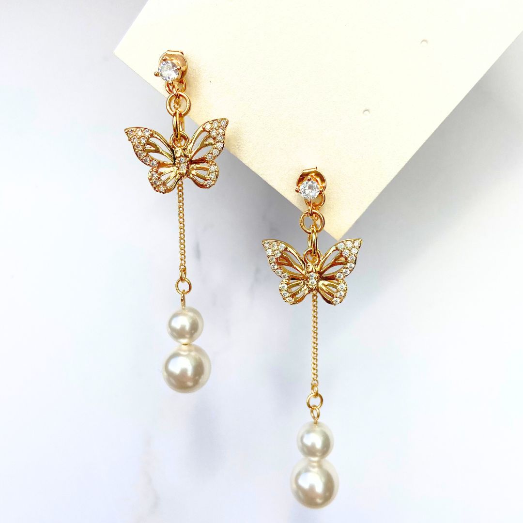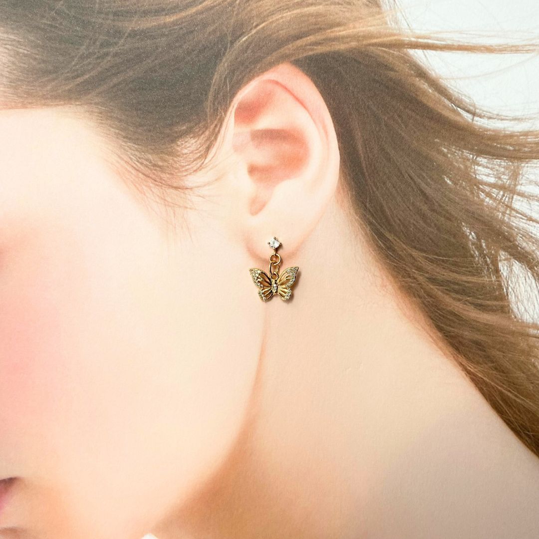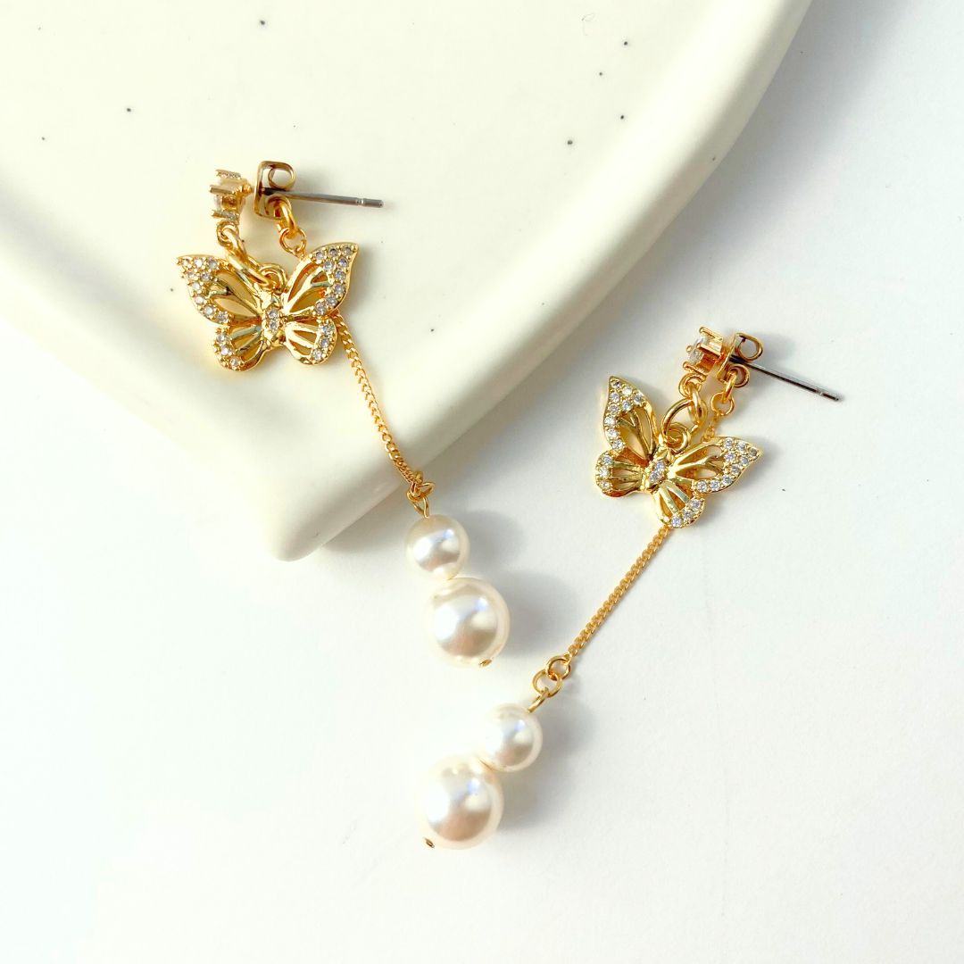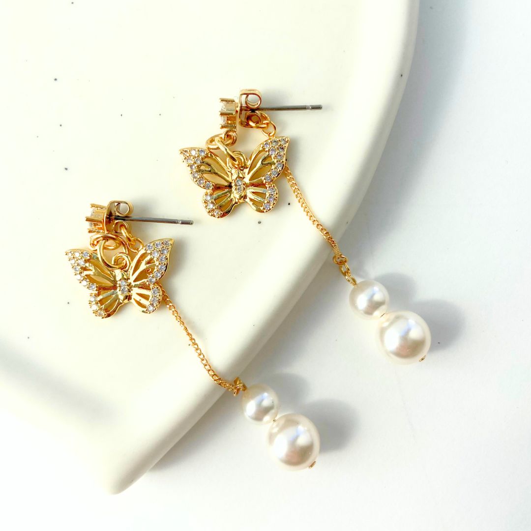 存在感のある2連のパールと、ストーンが敷き詰められたバタフライが耳元を華やかに照らしてくれるデザイン♪