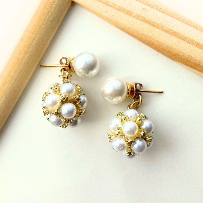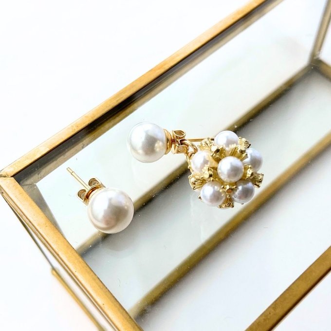 クラシックなパールとゴールドカラーのチャームが織りなすエレガントな2wayデザインのピアス。