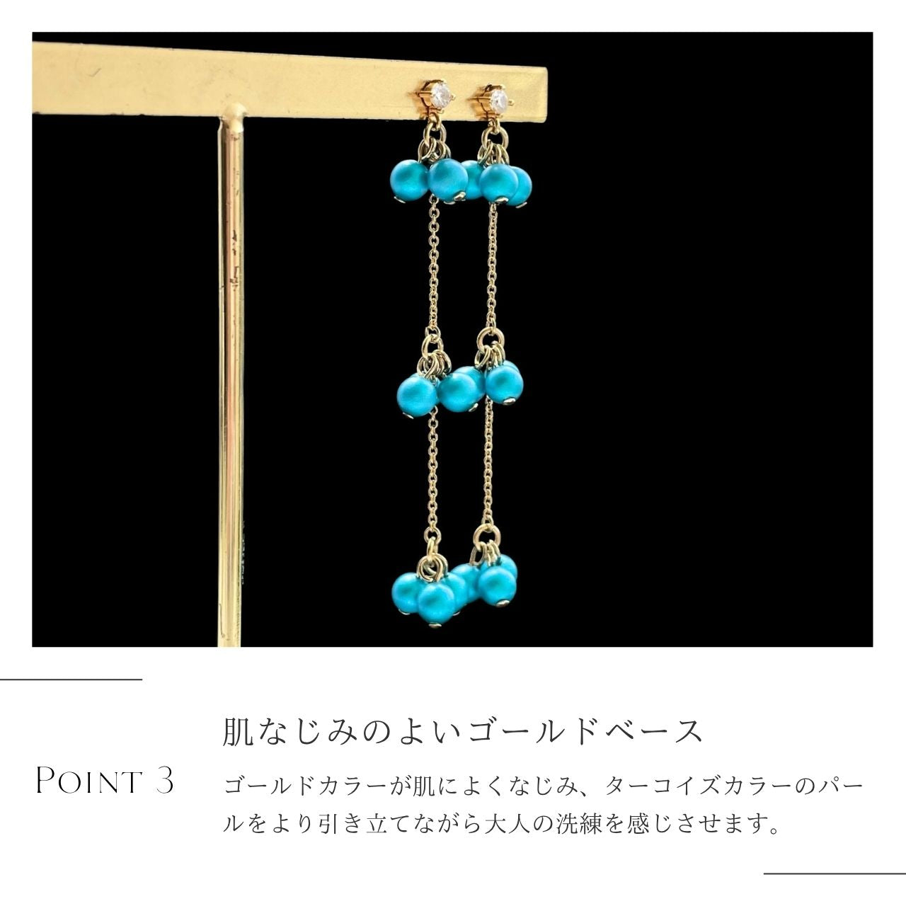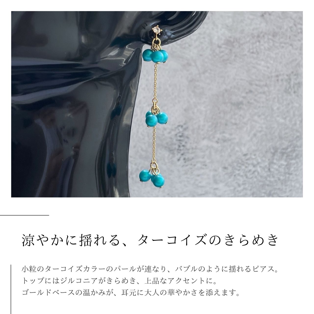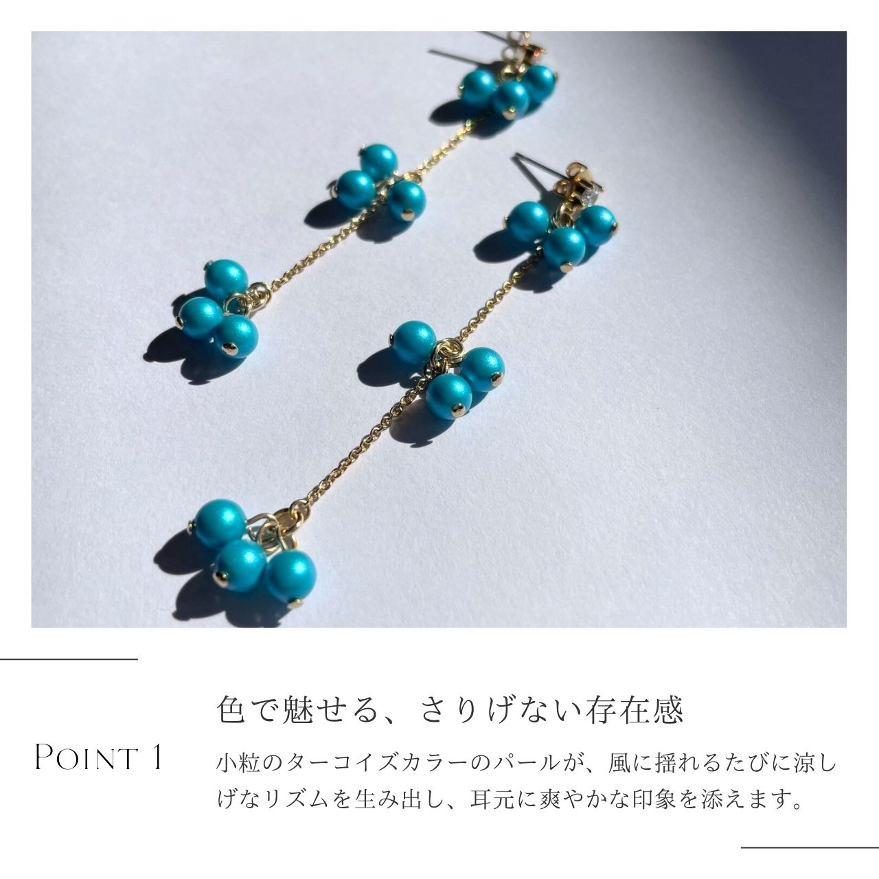 小粒のターコイズカラーのパールが連なり、まるでバブルのように軽やかに揺れるピアス。