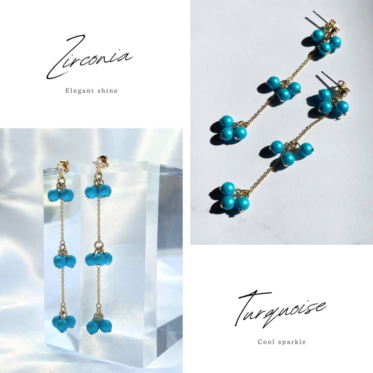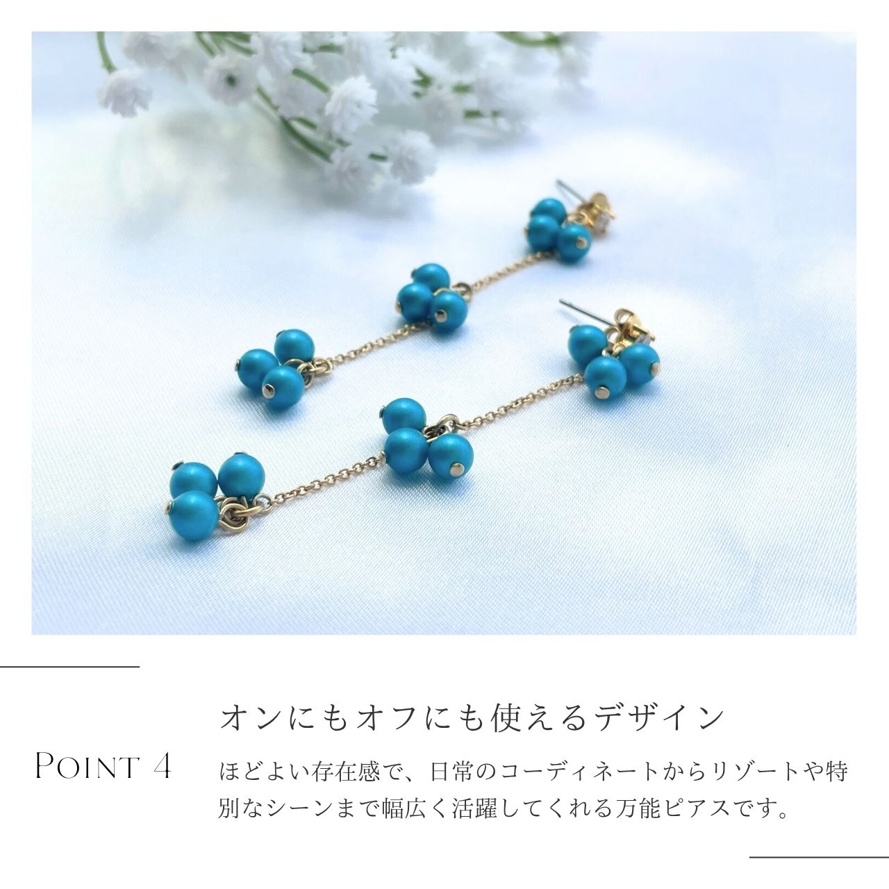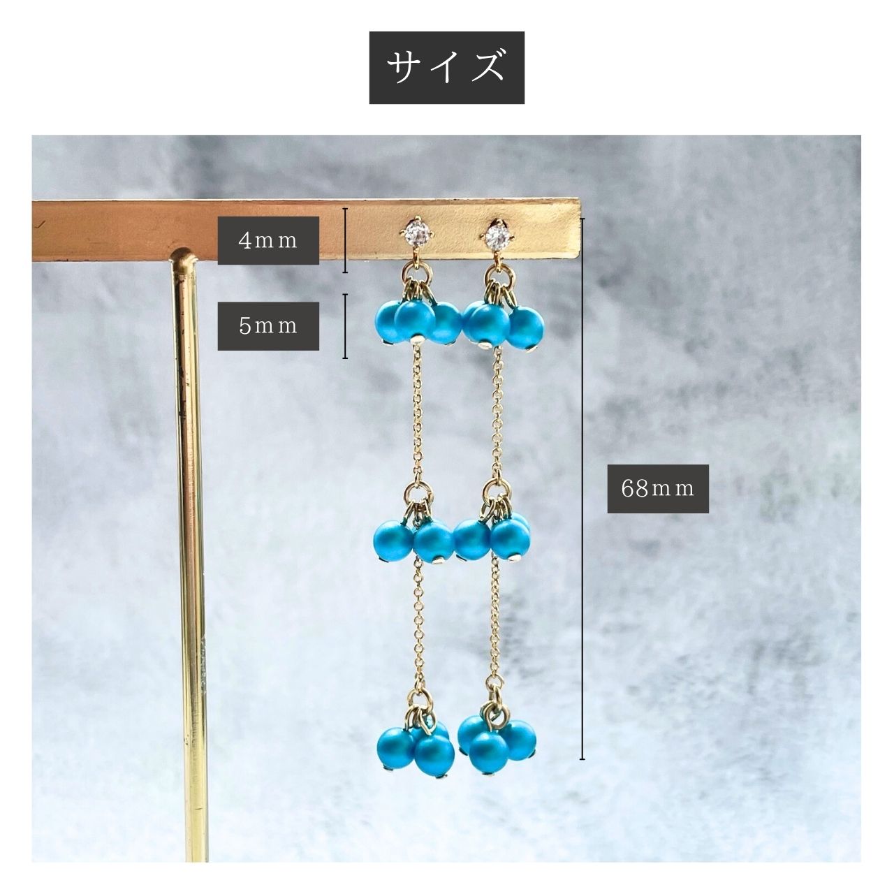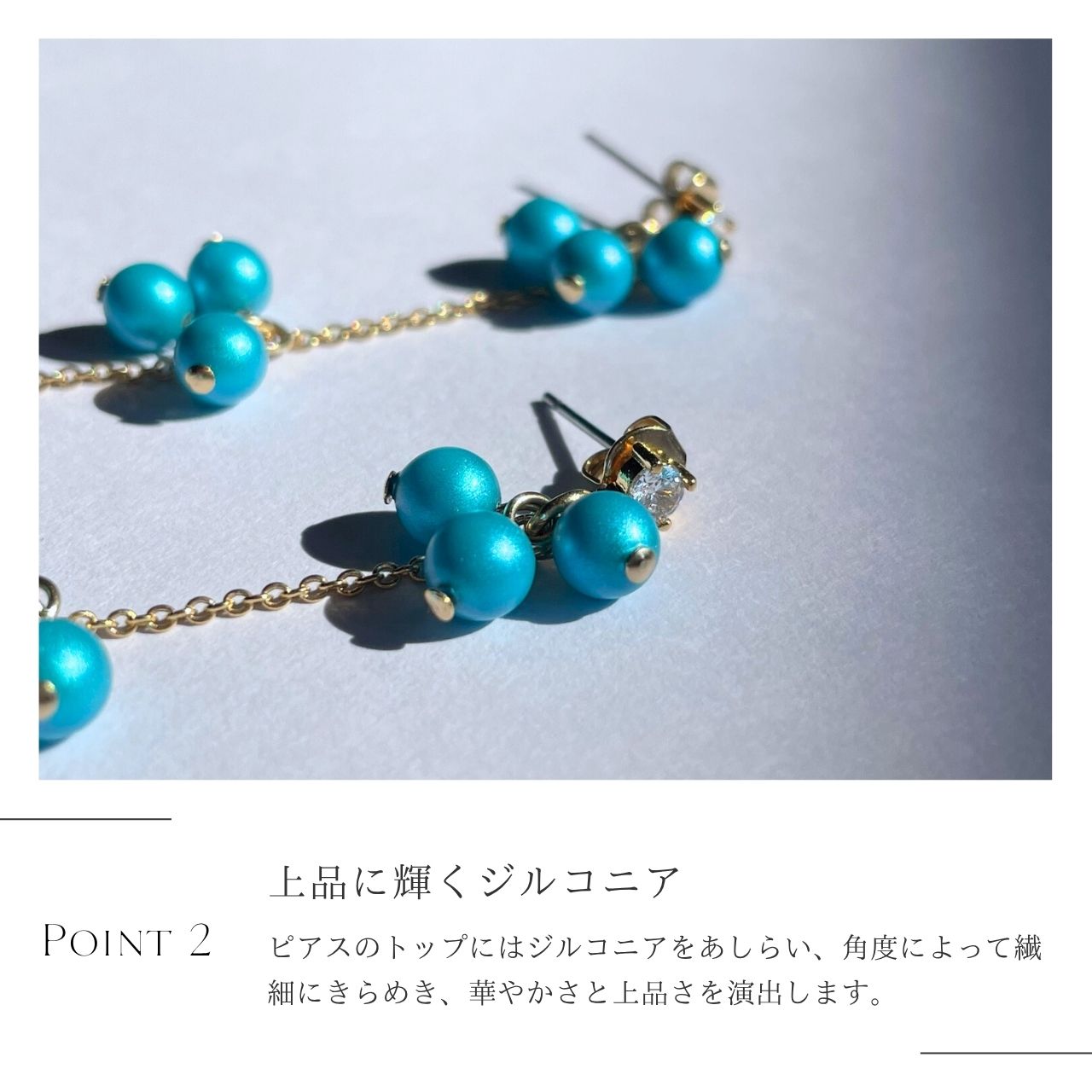 小粒のターコイズカラーのパールが連なり、まるでバブルのように軽やかに揺れるピアス。