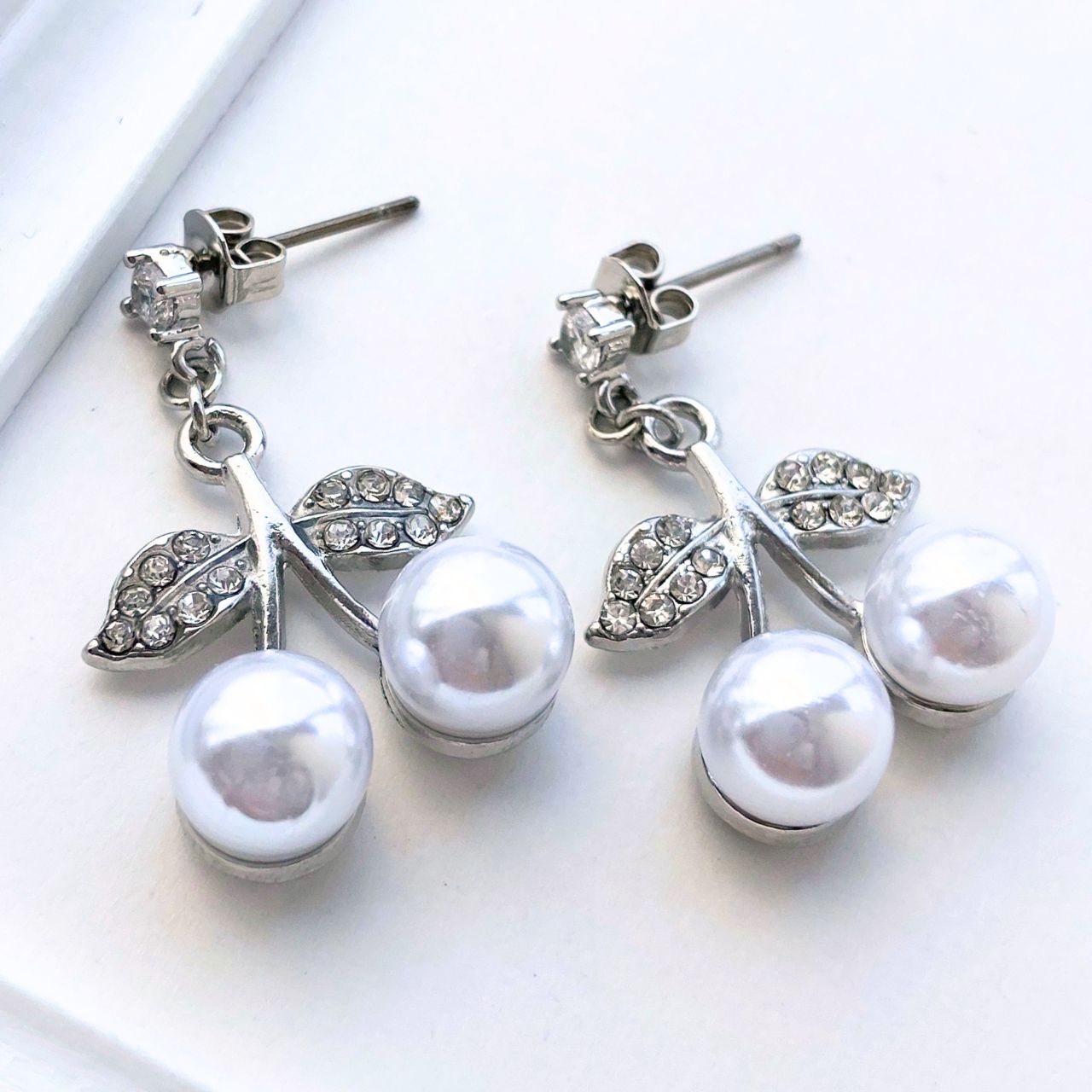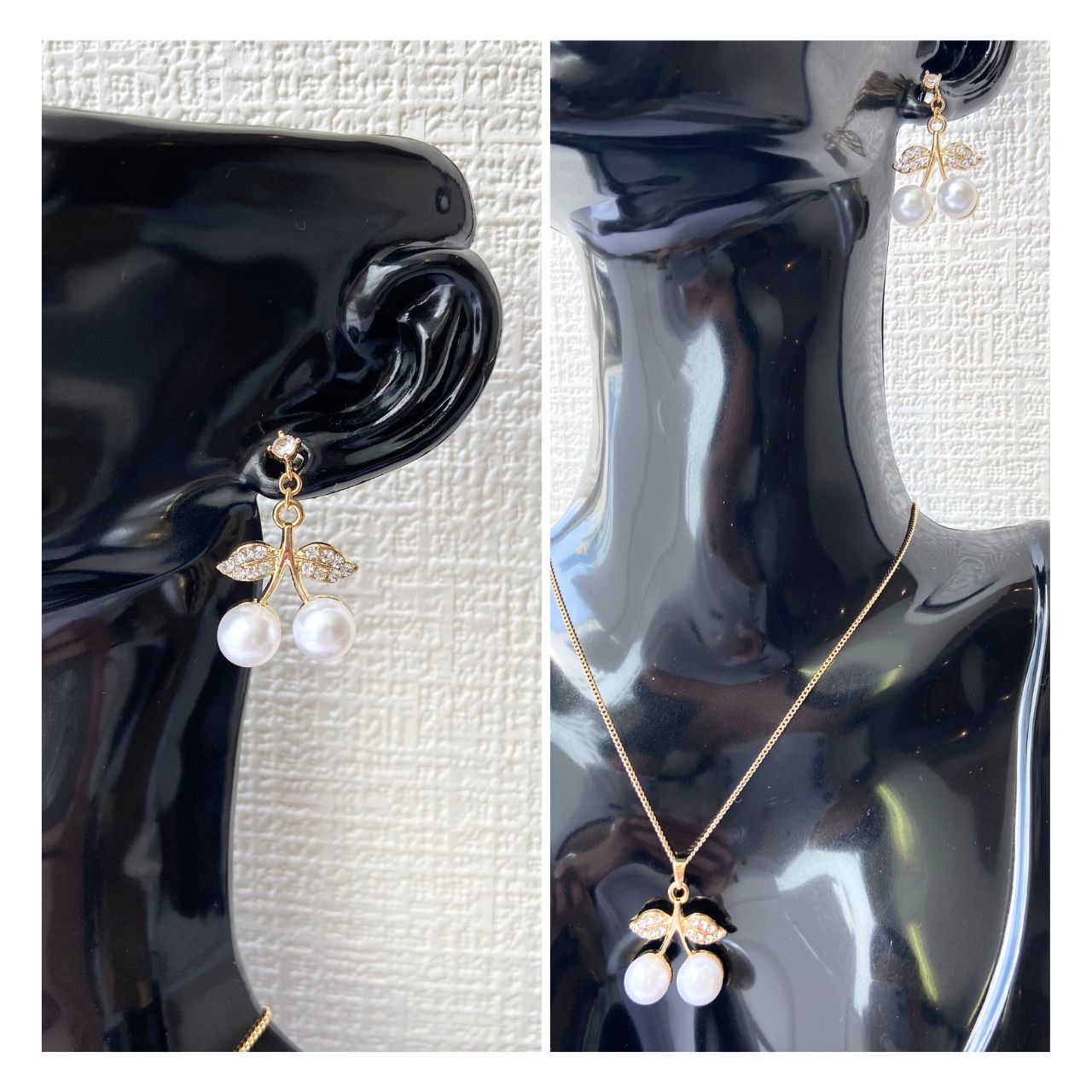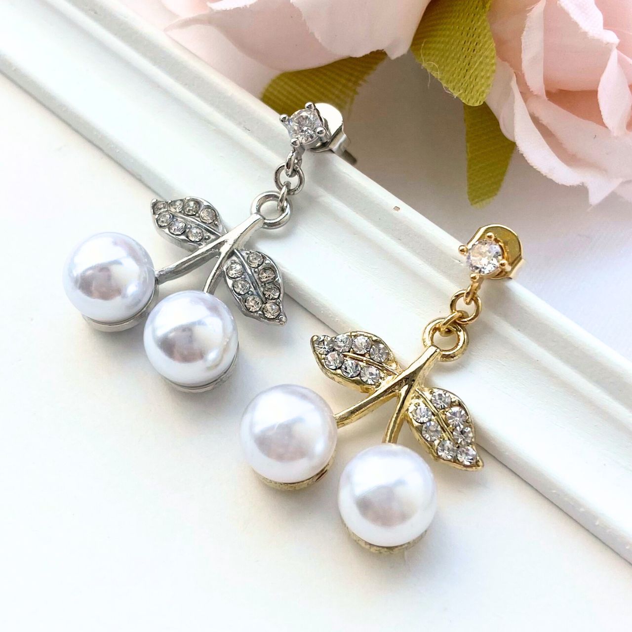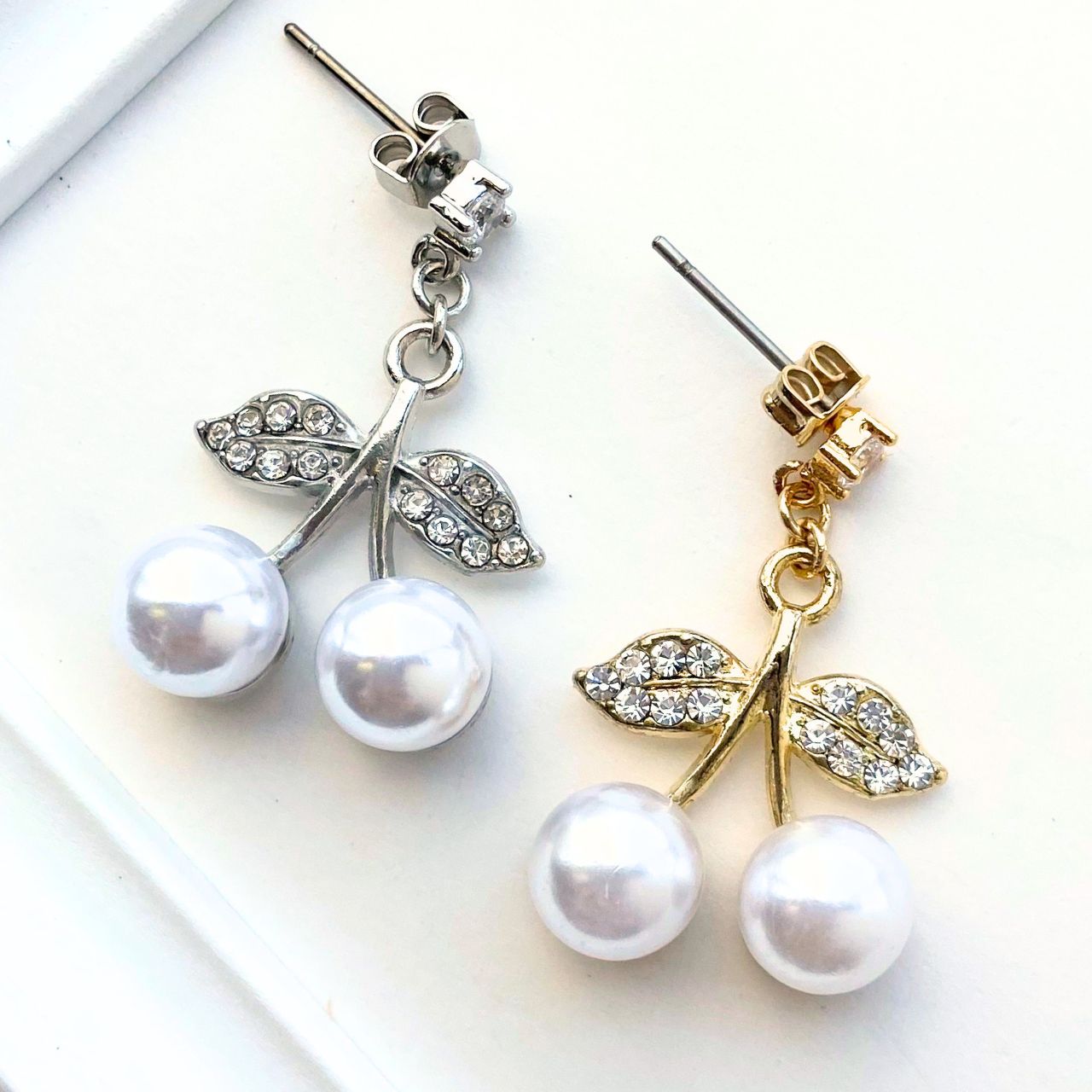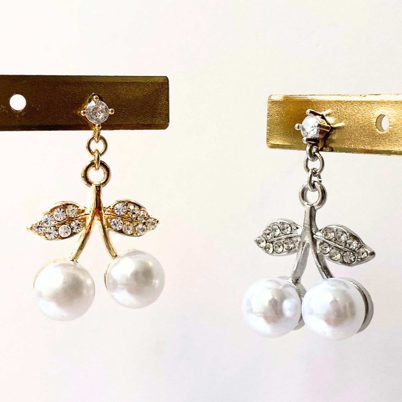 チェリーの葉に見立てた部分には、小さなラインストーンが丁寧に埋め込まれており、繊細な輝きを放ちます。