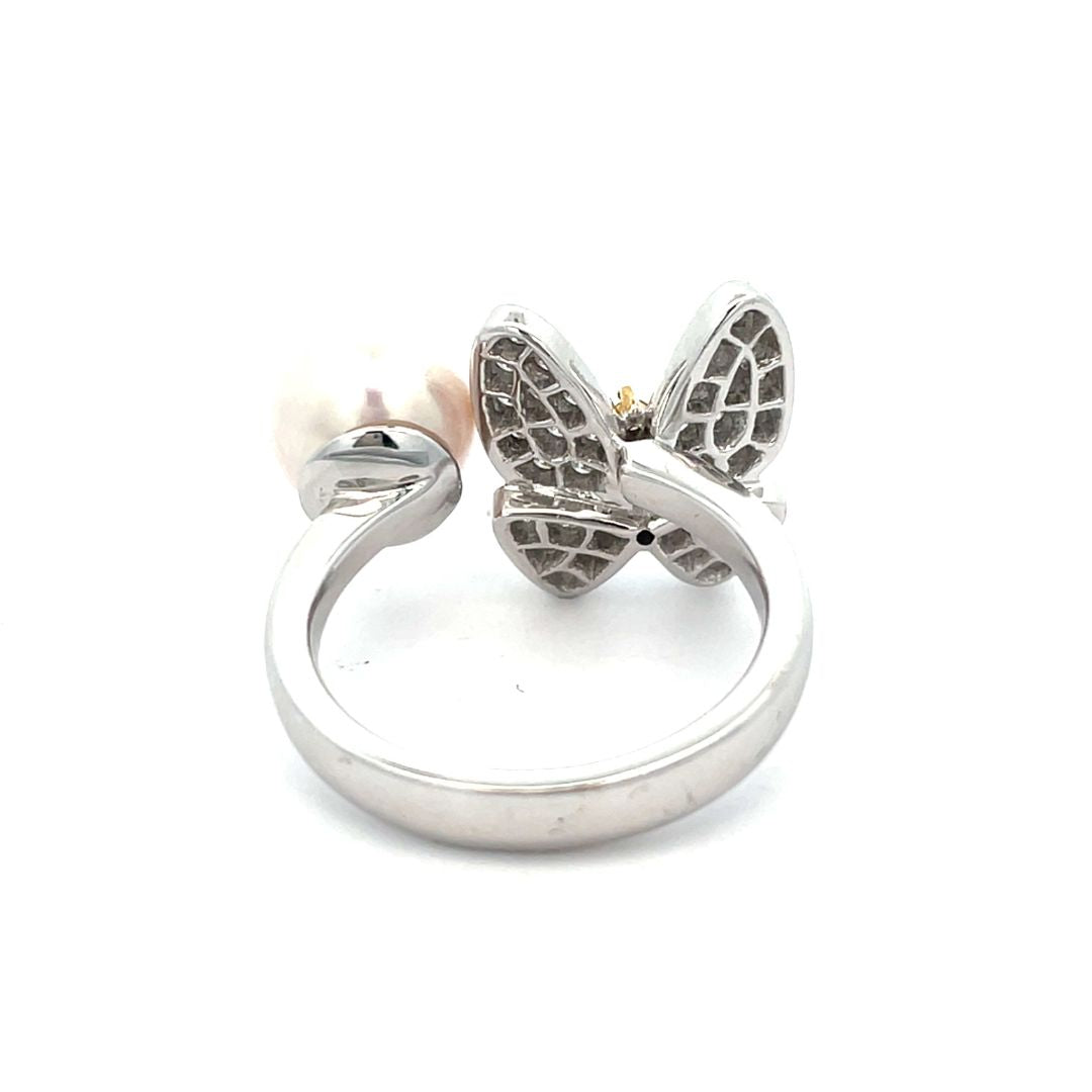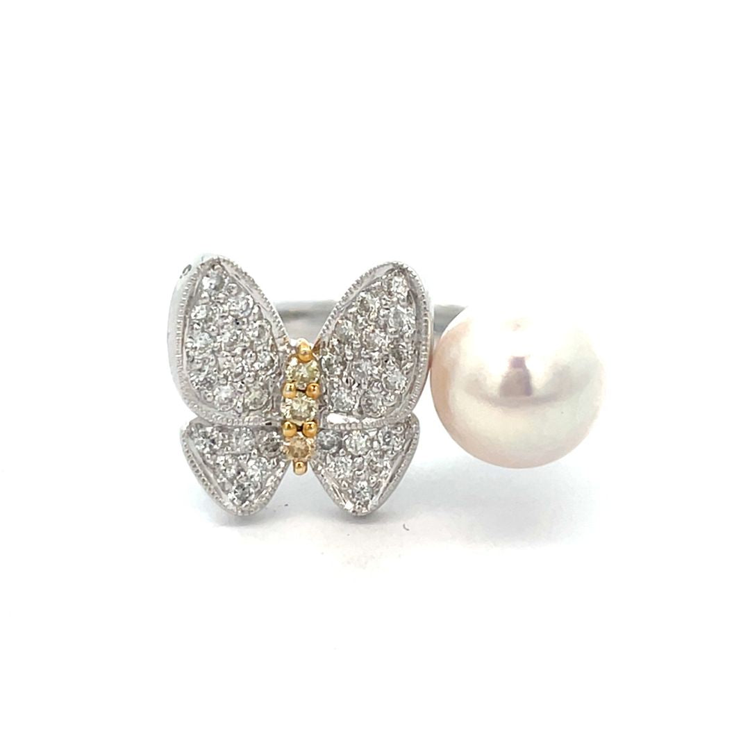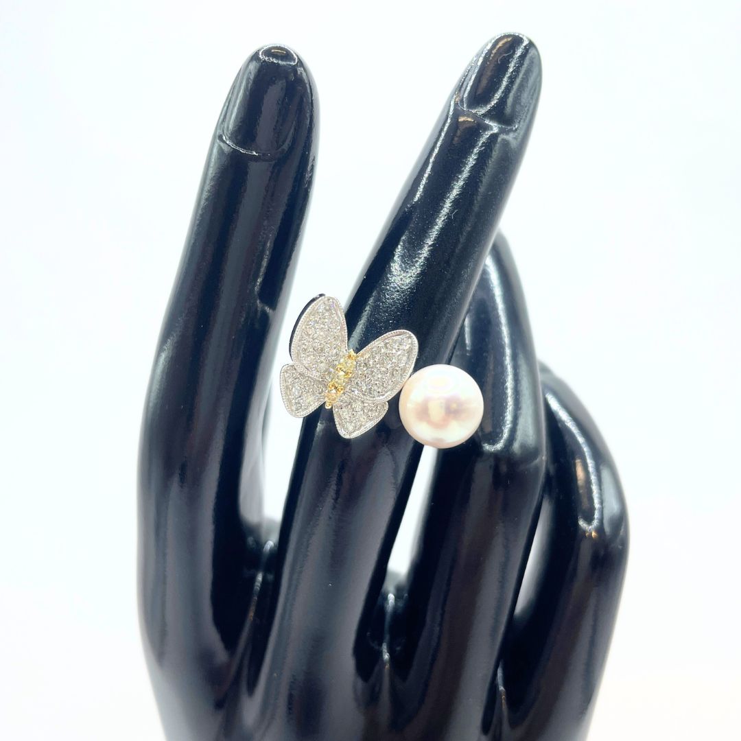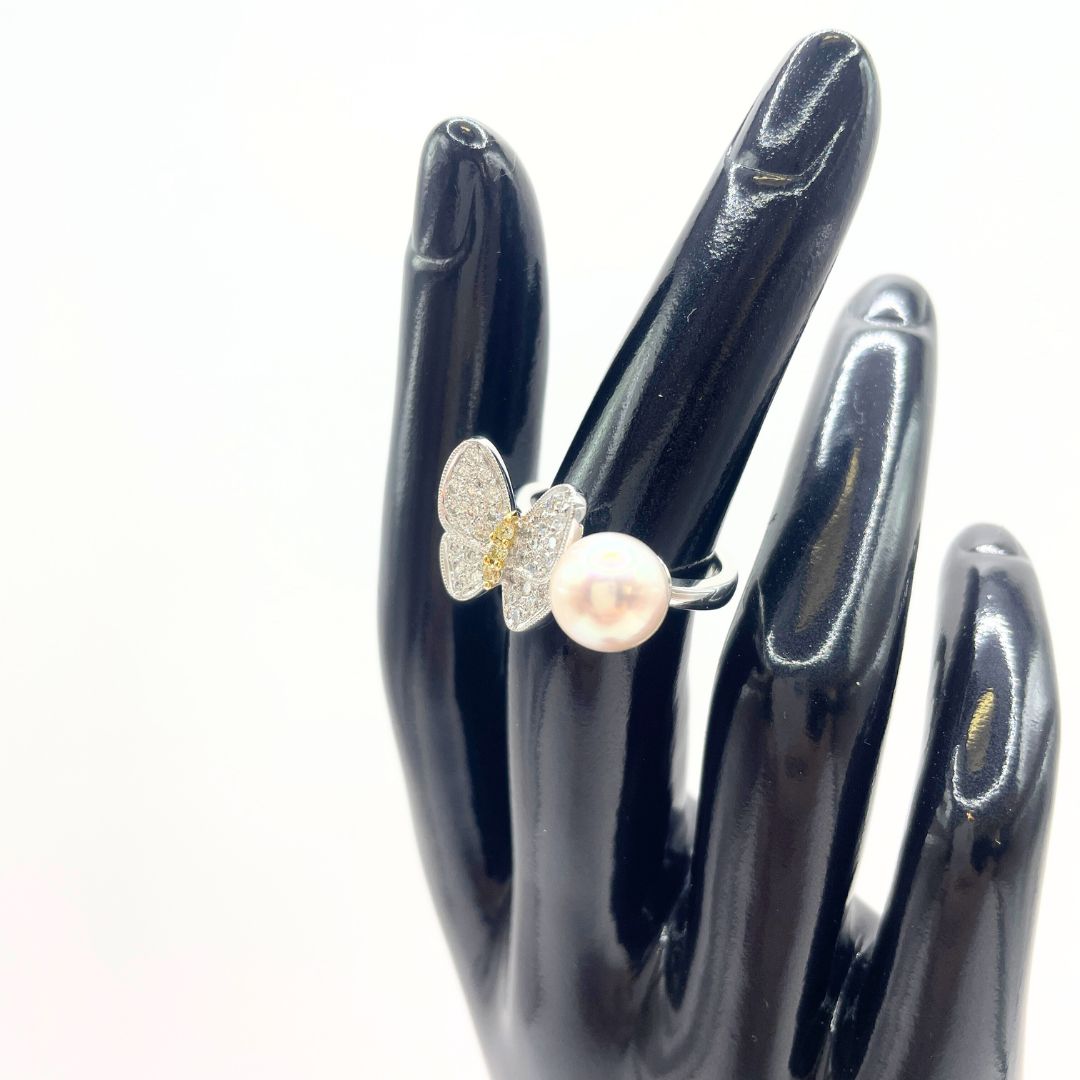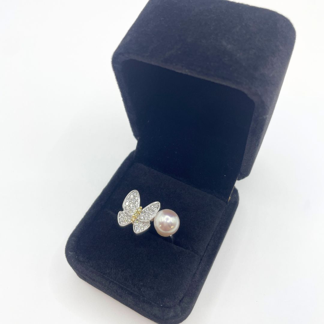 | コメント | パールの上品な艶めきと、繊細なバタフライモチーフが目を引くデザイン性の高いリングです。 バタフライには多数のダイヤモンドが敷き詰められ、その中心には希少なイエローダイヤモンドをセット。 控えめながらも確かな存在感があり、指元に華やかさと遊び心を与えてくれる逸品です。 素材にはK18ホワイトゴールドを使用し、シルバートーンでまとめられたデザインは洗練された印象を演出します。 |